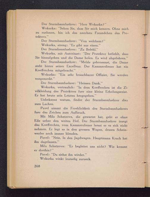 Mit Milo Schatzova, die gewartet hat, geht er ohneEile ueber den weiten Hof. Der Sturmbannfuehrer traegtdas Koefferchen, vom Kammerdiener laesst er es sich nichtnehmen. Er legt es in den grossen Wagen, dessen Schein-werfer noch immer blenden.