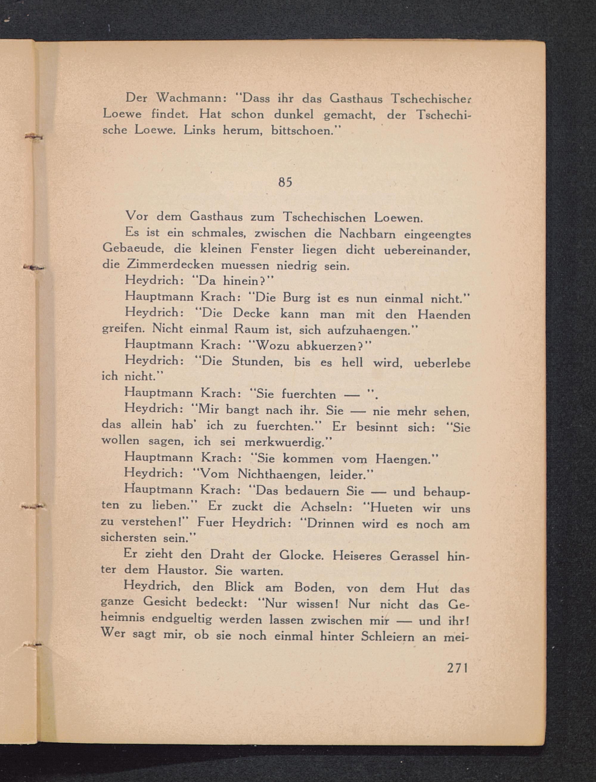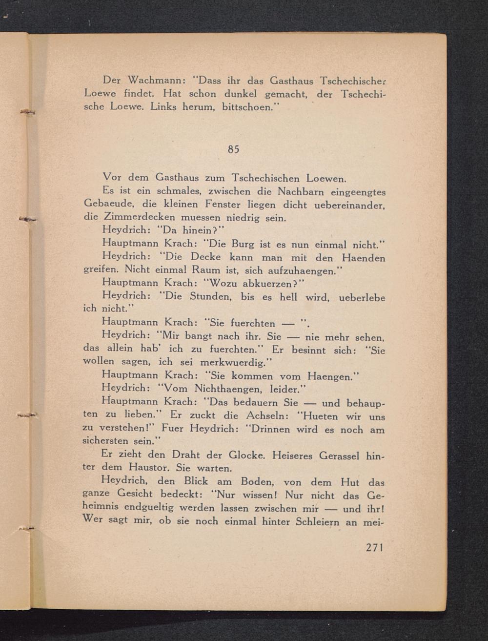 Heydrich : “Mir bangt nach ihr. Sie — nie mehr sehen,das allein hab’ ich zu fuerchten.” Er besinnt sich: “Siewollen sagen, ich sei merkwuerdig.”