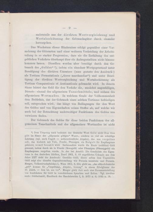 Das Wachstum dieser Hindernisse erfolgt gegenüber einer Ver-mehrung der Güterarten und einer weiteren Verästelung der Arbeits-teilung in so starker Progression, dass sie die Entfaltung des ent-geltlichen Verkehres überhaupt über ein Anlängsstadium nicht hinaus-kommen lassen. Dieselben werden aber beseitigt durch den Ge-brauch des „Geldes“ : ), indem ein einzelner Wertgegenstand unterBeseitigung des direkten Umsatzes (man gestatte den Ausdruck:)als Tertium Permutationis („tierce marchandisc“) und unter Besei-tigung der direkten Wertvergleichung und Wertabschätzung alsTertium Comparationis et Aestimationis gebraucht wird. In diesemSinne leistet das Geld für den Verkehr die, zunächst augenfälligen,Dienste: einmal des allgemeinen Tauschmittels, und sodann desallgemeinen Wertmaßes. In welchem Grade der Vollkommenheitdem Bedürfnis, das der Gebrauch eines solchen Tertiums befriedigensoll, entsprochen wird, das hängt von Bedingungen für den AVertdes Geldes und von Eigenschaften seines Stolfes ab, auf welche wirauch bei der Betrachtung anderweitiger Funktionen des Geldes unsverwiesen linden.
