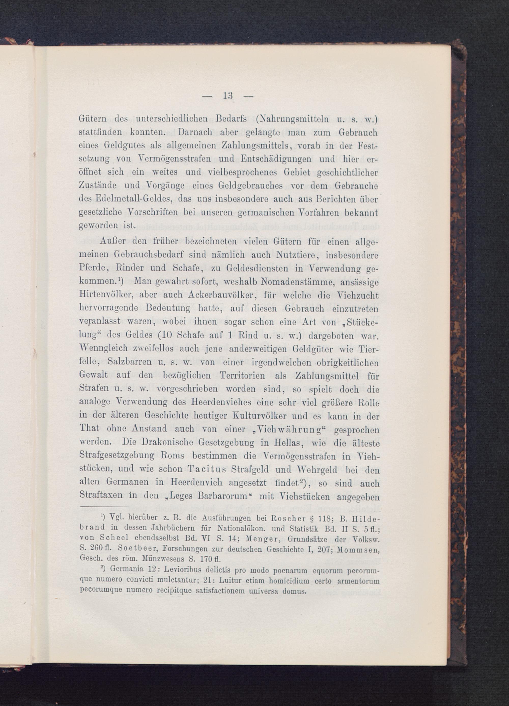 Außer den früher bezeichnoten vielen Gütern für einen allge-meinen Gebrauchsbedarf sind nämlich auch Nutztiere, insbesonderePferde, Rinder und Schafe, zu Geldesdiensten in Verwendung ge-kommen. 1 ) Man gewahrt sofort, weshalb Nomadenstämme, ansässigeHirtenvölker, aber auch Ackerbauvölker, für welche die Viehzuchthervorragende Bedeutung hatte, auf diesen Gebrauch cinzutretenveranlasst waren, wobei ihnen sogar schon eine Art von „Stücke-lung“ des Geldes (10 Schafe auf 1 Rind u. s. w.) dargeboten war.Wenngleich zweifellos auch jene anderweitigen Geldgütcr wie Tier-felle, Salzbarren u. s. w. von einer irgendwelchen obrigkeitlichenGewalt auf den bezüglichen Territorien als Zahlungsmittel fürStrafen u. s. w. vorgeschrieben worden sind, so spielt doch dieanaloge Verwendung des Ileerdenviehes eine sehr viel größere Rollein der älteren Geschichte heutiger Kulturvölker und es kann in derThat ohne Anstand auch von einer „Vielnvährung“ gesprochenwerden. Die Drakonische Gesetzgebung in Hellas, wie die ältesteStrafgesetzgebung Roms bestimmen die Vermögensstrafen in Vieh-stücken, und wie schon Tacitus Strafgeld und Wehrgeld bei denalten Germanen in Heerdenvieh angesetzt findet 2 ), so sind auchStraftaxen in den „Leges Barbarorum“ mit Viehstücken angegeben