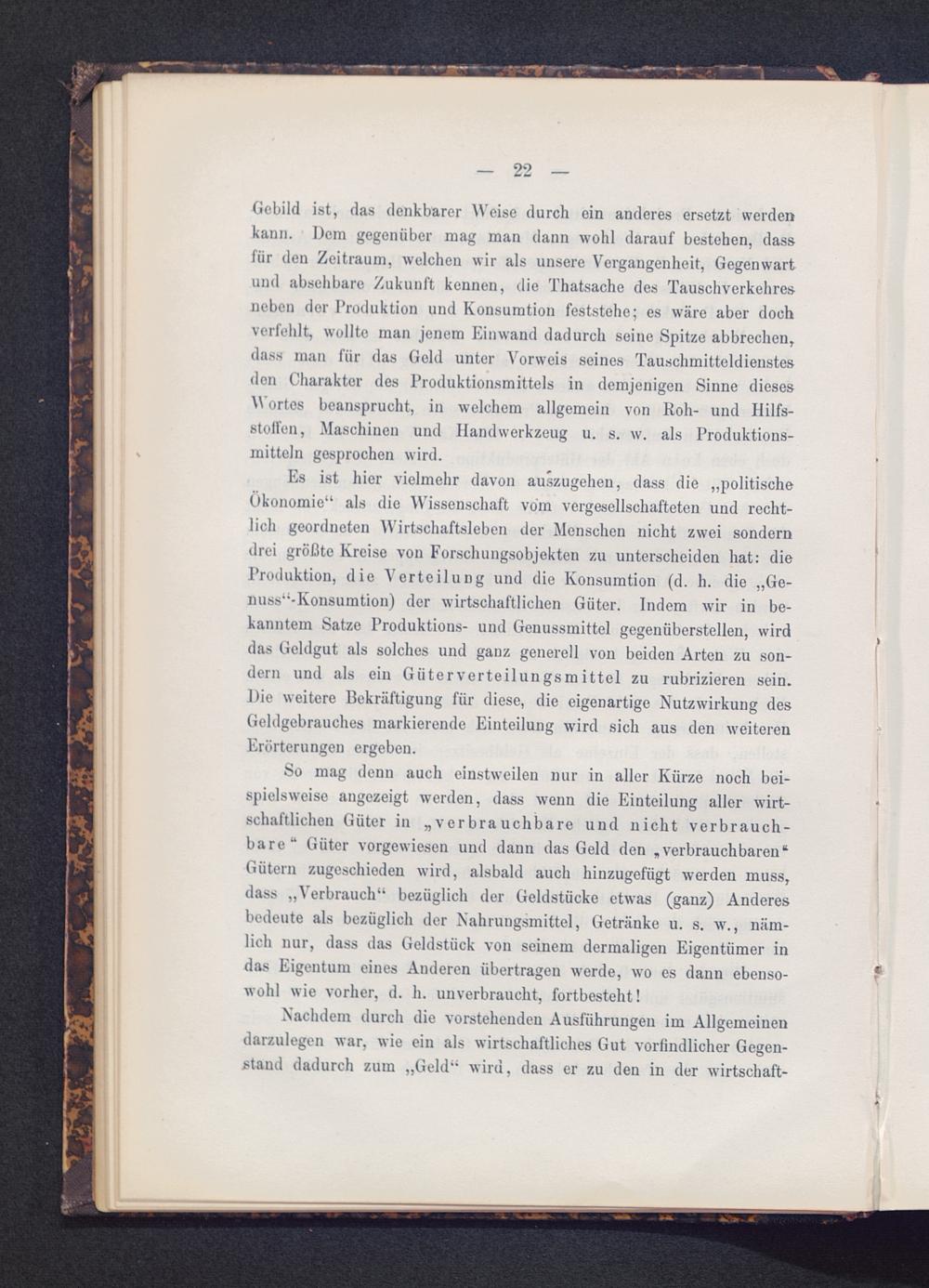 Es ist hier vielmehr davon auszugehen, dass die „politischeÖkonomie“ als die Wissenschaft vom vergesellschafteten und recht-lich geordneten Wirtschaftsleben der Menschen nicht zwei sonderndrei größte Kreise von Forschungsobjekten zu unterscheiden hat: dieProduktion, die Verteilung und die Konsumtion (d. h. die „Ge-nuss“-Konsumtion) der wirtschaftlichen Güter. Indem wir in be-kanntem Satze Produktions- und Genussmittel gegenüberstellen, wirddas Geldgut als solches und ganz generell von beiden Arten zu son-dern und als ein Güterverteilungsmittel zu rubrizieren sein.Die weitere Bekräftigung für diese, die eigenartige Nutzwirkung desGeldgebrauches markierende Einteilung wird sich aus den weiterenErörterungen ergeben.