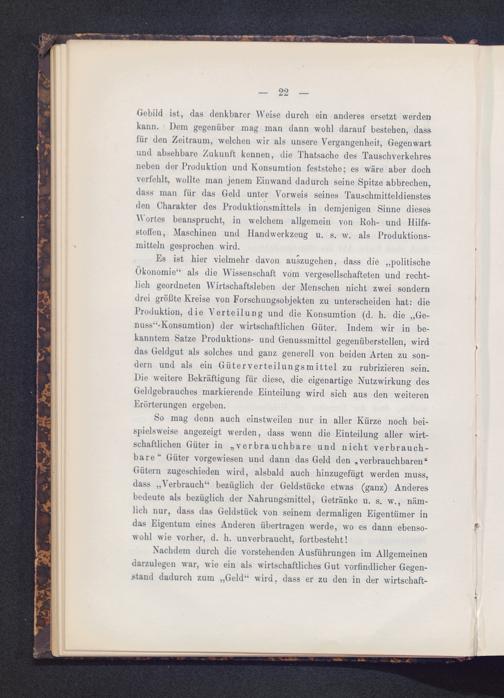 So mag denn auch einstweilen nur in aller Kürze noch bei-spielsweise angezeigt werden, dass wenn die Einteilung aller wirt-schaftlichen Güter in „verbrauchbare und nicht verbrauch-bare“ Güter vorgewiesen und dann das Geld den „verbrauchbaren“Gütern zugeschioden wird, alsbald auch hinzugefügt werden muss,dass „Verbrauch“ bezüglich der Geldstücke etwas (ganz) Anderesbedeute als bezüglich der Nahrungsmittel, Getränke u. s. w., näm-lich nur, dass das Geldstück von seinem dermaligen Eigentümer indas Eigentum eines Anderen übertragen werde, wo es dann ebenso-wohl wie vorher, d. h. unverbraucht, fortbesteht!