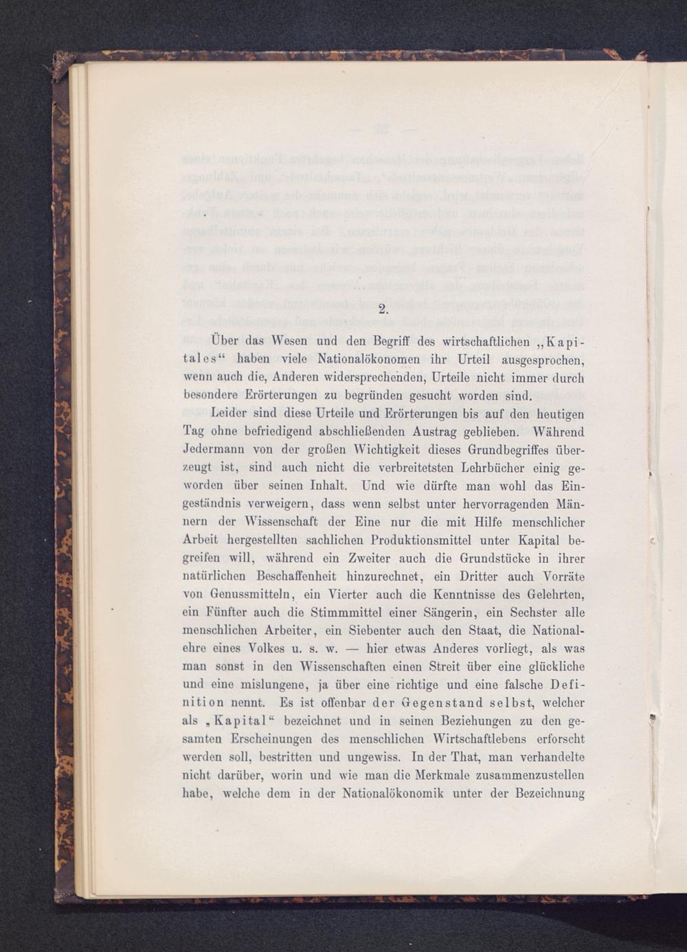 Uber das Wesen und den Begriff des wirtschaftlichen „Kapi-tales“ haben viele Nationalökonomen ihr Urteil ausgesprochen,wenn auch die, Anderen widersprechenden, Urteile nicht immer durchbesondere Erörterungen zu begründen gesucht worden sind.