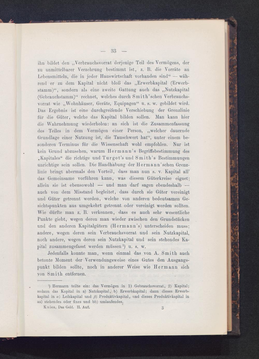 ihn bildet den „Verbrauehsvorrat derjenige Teil des Vermögens, derzu unmittelbarer Verzehrung bestimmt ist, z. B. die Vorräte anLebensmitteln, die in jeder Hauswirtschaft vorhanden sind“ — wäh-rend er zu dem Kapital nicht bloß das „Erwerbkapital (Erwerb-stamm)“, sondern als eine zweite Gattung auch das „Nutzkapital(Gebrauchstamm)“ rechnet, welches durch Smith’schen Verbrauchs-vorrat wie „Wohnhäuser, Geräte, Equipagen“ u. s. w. gebildet wird.Das Ergebnis ist eine durchgreifende Verschiebung der Grenzliniefür die Güter, welche das Kapital bilden sollen. Man kann hierdie Wahrnehmung wiederholen: an sich ist die Zusammenfassungdes Teiles in dem Vermögen einer Person, „welcher dauerndeGrundlage einer Nutzung ist, die Tauschwert hat“, unter einem be-sonderen Terminus für die AVissenschaft wohl empfohlen. Nur istkein "Grund abzusehen, warum Hermann’« Begriffsbestimmung des,Kapitales“ die richtige und Turgot’s und Smith’s Bestimmungenunrichtige sein sollen. Die Handhabung der Hermann’sehen Grenz-linie bringt abermals den Vorteil, dass man nun s. v. Kapital all’das Gemeinsame vorführen kann, was diesem Güterkreise eignet;allein sie ist ebensowohl — und man darf sagen ebendeshalb —auch von dem Misstand begleitet, dass durch sie Güter vereinigtund Güter getrennt werden, welche von anderen bedeutsamen Ge-sichtspunkten aus umgekehrt getrennt oder vereinigt werden sollten.Wie dürfte man z. B. verkennen, dass es auch sehr wesentlichePunkte giebt, wegen deren man wieder zwischen den Grundstückenund den anderen Kapitalgütern (Hermann’s) unterscheiden muss;andere, wegen deren sein Verbrauchs Vorrat und sein Nutzkapital,noch andere, wegen deren sein Nutzkapital und sein stehendes Ka-pital zusammengefasst werden müssen') u. s. w.