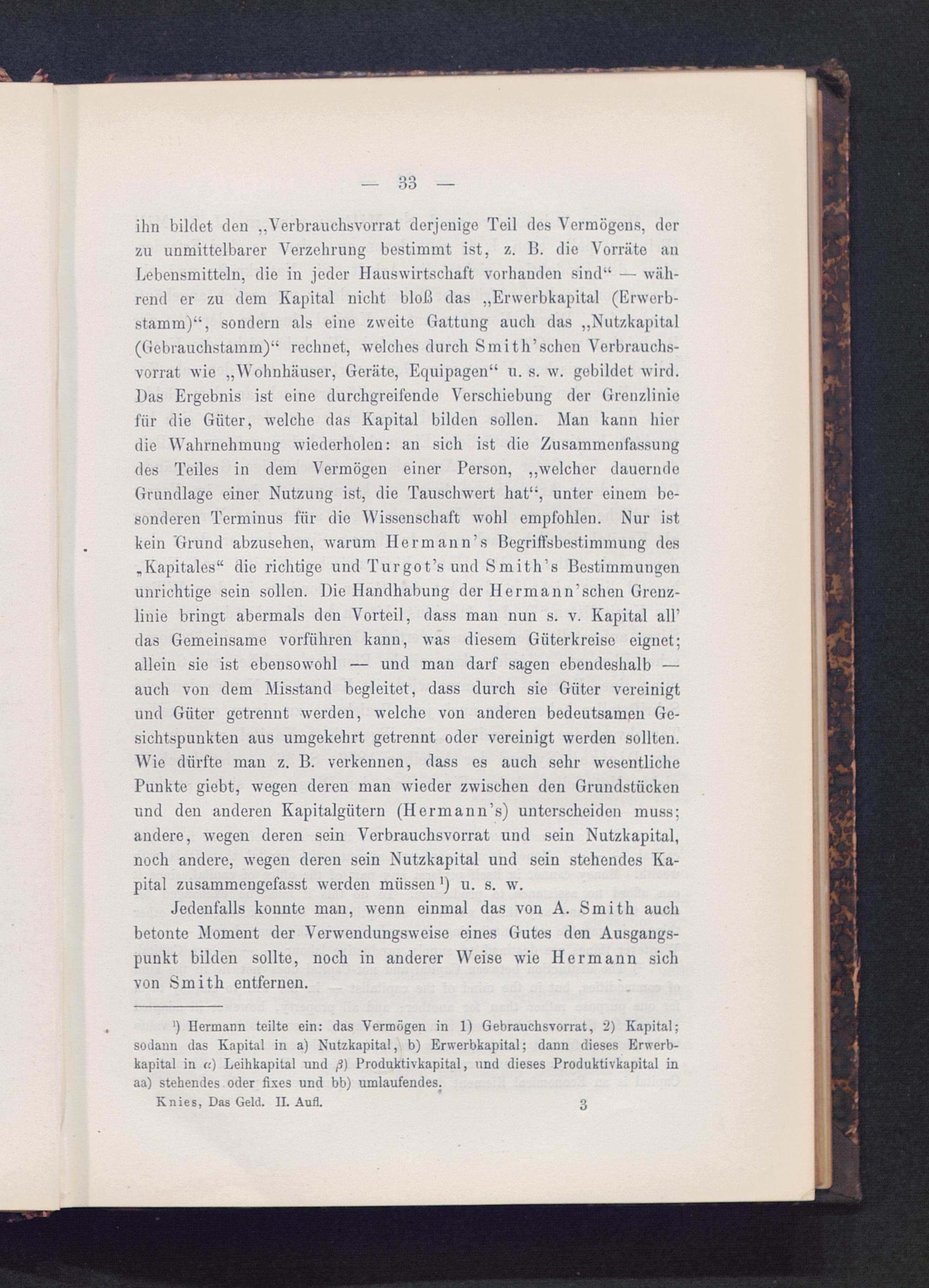 ‘) Hermann teilte ein: das Vermögen in 1) Gebrauchsvorrat, 2) Kapital;sodann das Kapital in a) Nutzkapital, b) Erwerbkapital; dann dieses Erwerb-kapital in r<) Leihkapital und ß) Produktivkapital, und dieses Produktivkapital inaa) stehendes oder fixes und bb) umlaufendes.