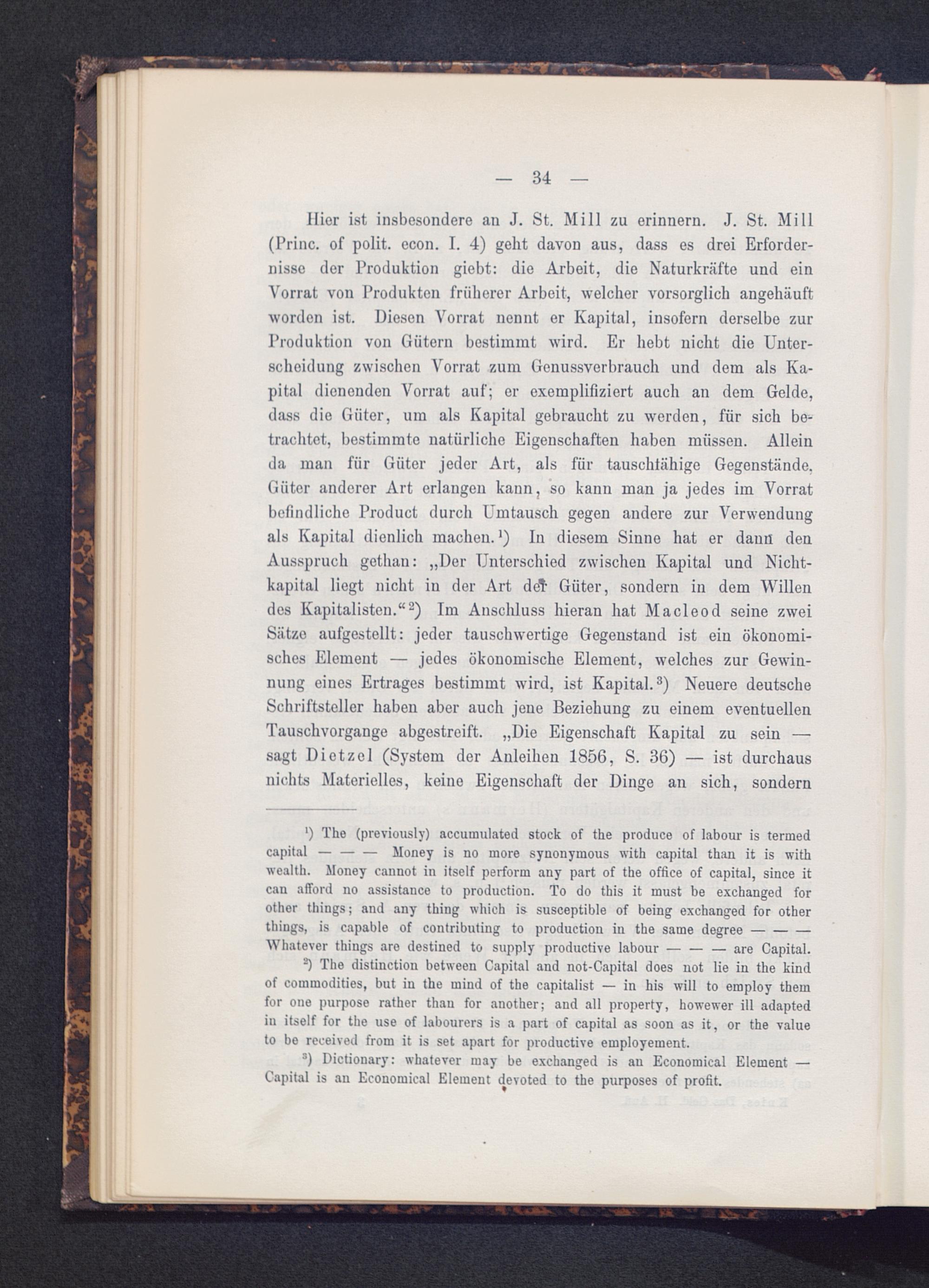 Hier ist insbesondere an J. St. Mill zu erinnern. J. St. MiII(Princ. of polit. econ. I. 4) geht davon aus, dass es drei Erforder-nisse der Produktion giebt: die Arbeit, die Naturkräfte und einVorrat von Produkten früherer Arbeit, welcher vorsorglich angehäuftworden ist. Diesen Vorrat nennt er Kapital, insofern derselbe zurProduktion von Gütern bestimmt wird. Er hebt nicht die Unter-scheidung zwischen Vorrat zum Genussverbrauch und dem als Ka-pital dienenden Vorrat auf; er exemplifiziert auch an dem Gelde,dass die Güter, um als Kapital gebraucht zu werden, für sich be^trachtet, bestimmte natürliche Eigenschaften haben müssen. Alleinda man für Güter jeder Art, als für tauschtähige Gegenstände.Güter anderer Art erlangen kann, so kann man ja jedes im Vorratbefindliche Product durch Umtausch gegen andere zur Verwendungals Kapital dienlich machen. ’) In diesem Sinne hat er daun denAusspruch gethau: „Der Unterschied zwischen Kapital und Nicht-kapital liegt nicht in der Art de! Güter, sondern in dem Willendes Kapitalisten.“ 2 ) Im Anschluss hieran hat Macleod seine zweiSiitzo aufgestellt: jeder tauschwertige Gegenstand ist ein ökonomi-sches Element — jedes ökonomische Element, welches zur Gewin-nung eines Ertrages bestimmt wird, ist Kapital. 3 ) Neuere deutscheSchriftsteller haben aber auch jene Beziehung zu einem eventuellenTausch vorgange abgostreift. „Die Eigenschaft Kapital zu sein —sagt Dietzel (System der Anleihen 1856, S. 36) — ist durchausnichts Materielles, keine Eigenschaft der Dinge an sich, sondern