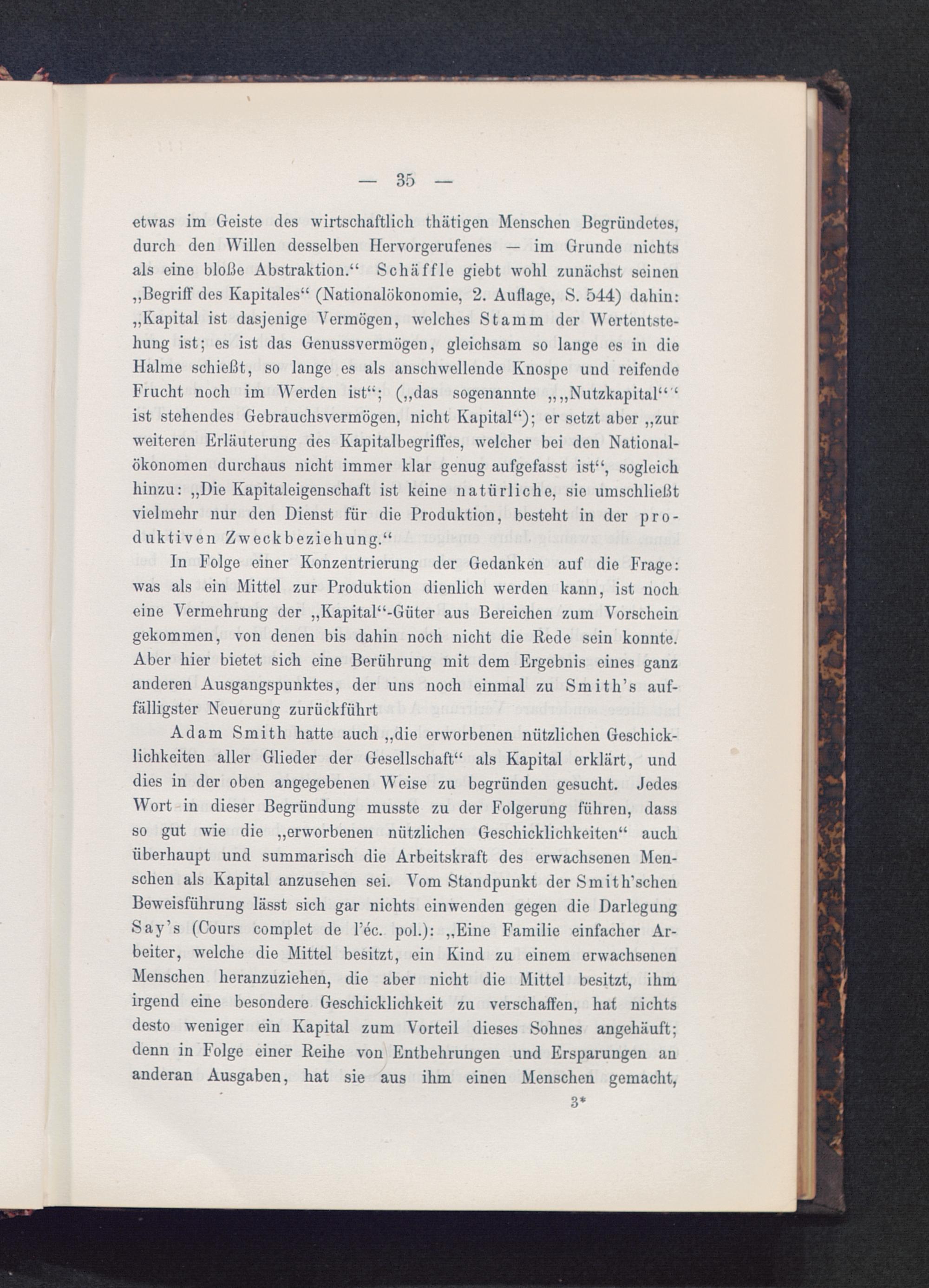 Adam Smith hatte auch „die erworbenen nützlichen Geschick-lichkeiten aller Glieder der Gesellschaft“ als Kapital erklärt, unddies in der oben angegebenen Weise zu begründen gesucht. JedesWort in dieser Begründung musste zu der Folgerung führen, dassso gut wie die „erworbenen nützlichen Geschicklichkeiten“ auchüberhaupt und summarisch die Arbeitskraft des erwachsenen Men-schen als Kapital anzusehen sei. Vom Standpunkt der Smith’schenBeweisführung lässt sich gar nichts einwenden gegen die DarlegungSay’s (Cours complet de l’ec. pol.): „Eine Familie einfacher Ar-beiter, welche die Mittel besitzt, ein Kind zu einem erwachsenenMenschen heranzuziehen, die aber nicht die Mittel besitzt, ihmirgend eine besondere Geschicklichkeit zu verschaffen, hat nichtsdesto weniger ein Kapital zum Vorteil dieses Sohnes angehäuft;denn in Folge einer Reihe von Entbehrungen und Ersparungen ananderan Ausgaben, hat sie aus ihm einen Menschen gemacht,