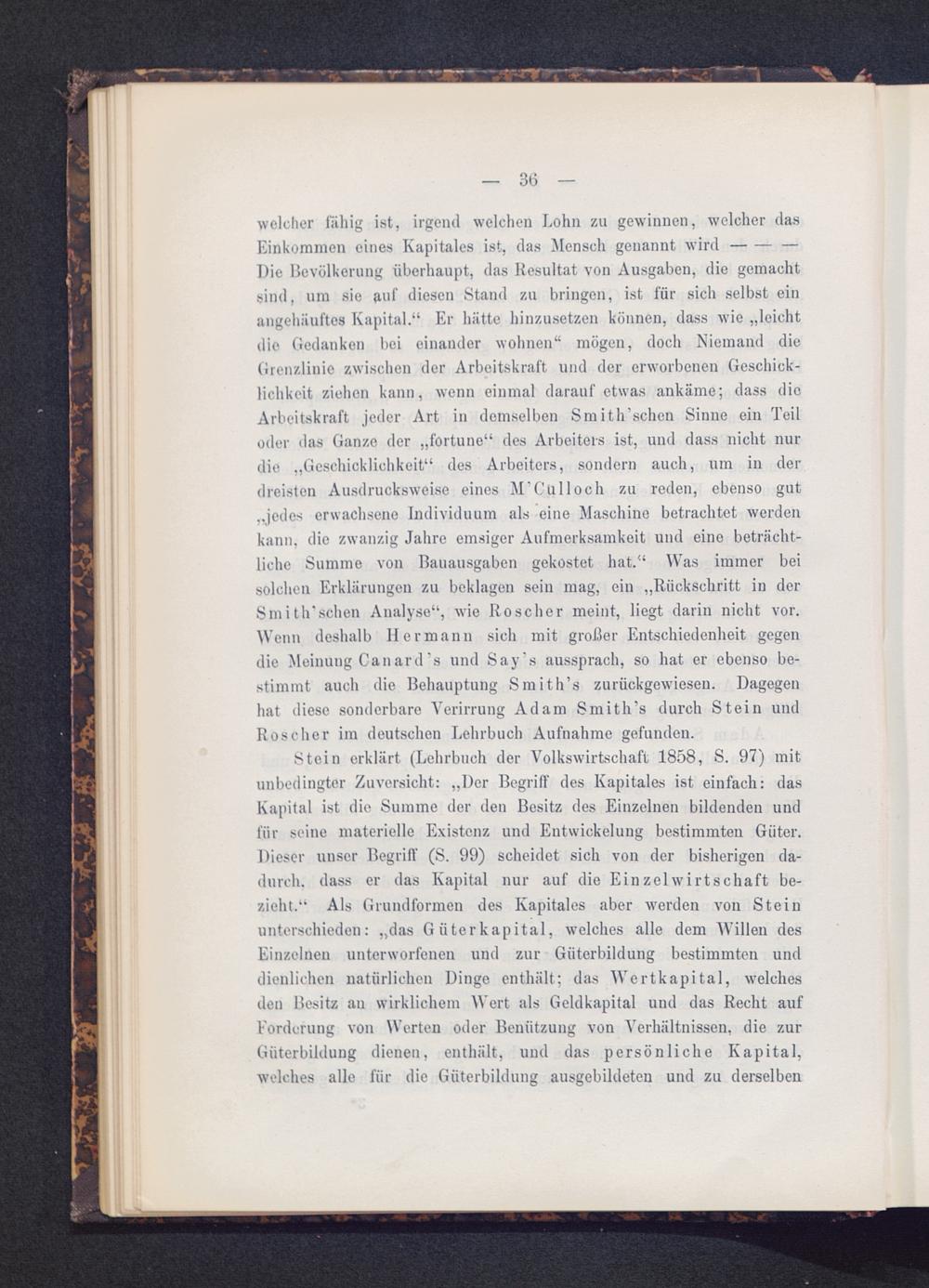 Die Bevölkerung überhaupt, das Resultat von Ausgaben, die gemachtsind, um sie iiuf diesen Stand zu bringen, ist für sich selbst einangehäuftes Kapital.“ Er hätte hinzusetzen können, dass wie „leichtdie Gedanken bei einander wohnen“ mögen, doch Niemand dieGrenzlinie zwischen der Arbeitskraft und der erworbenen Geschick-lichkeit ziehen kann, wenn einmal darauf etwas ankäme; dass dieArbeitskraft jeder Art in demselben Smith’schen Sinne ein Teiloder das Ganze der „fortune“ des Arbeiters ist, und dass nicht nurdie „Geschicklichkeit“ des Arbeiters, sondern auch, um in derdreisten Ausdrucksweise eines M 1 Gull och zu reden, ebenso gut„jedes erwachsene Individuum als eine Maschine betrachtet werdenkann, die zwanzig Jahre emsiger Aufmerksamkeit und eine beträcht-liche Summe von Bauausgaben gekostet hat.“ Was immer beisolchen Erklärungen zu beklagen sein mag, ein „Rückschritt in derSmith'schen Analyse“, wie Roscher meint, liegt darin nicht vor.Wenn deshalb Hermann sich mit großer Entschiedenheit gegendie Meinung Canard’s und Say’s aussprach, so hat er ebenso be-stimmt auch die Behauptung Smith’s zurückgewiesen. Dagegenhat diese sonderbare Verirrung Adam Smith’s durch Stein undRoscher im deutschen Lehrbuch Aufnahme gefunden.
