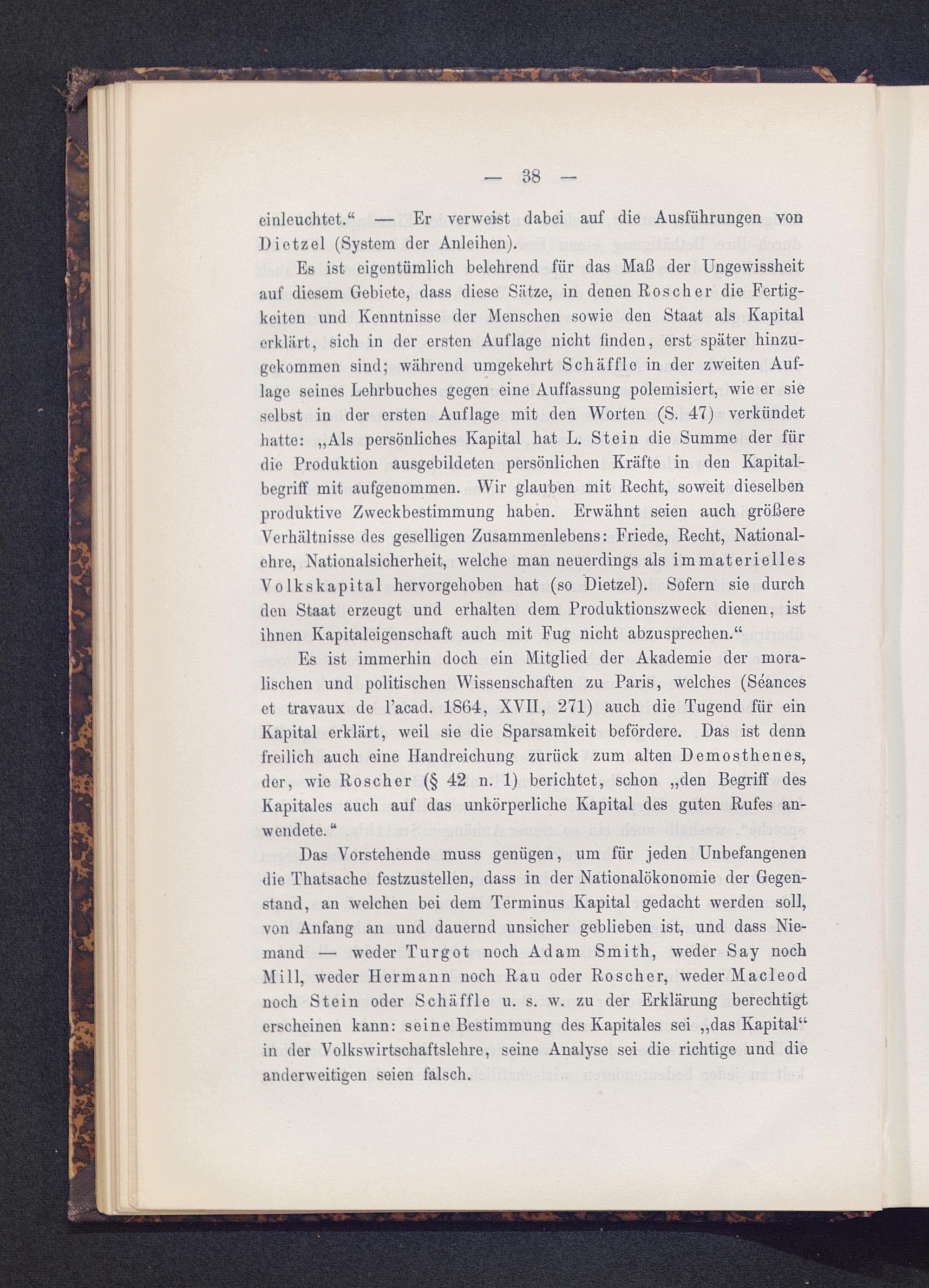 Es ist immerhin doch ein Mitglied der Akademie der mora-lischen und politischen Wissenschaften zu Paris , welches (Seanceset travaux de l’acad. 18(54, XVII, 271) auch die Tugend für einKapital erklärt, weil sie die Sparsamkeit befördere. Das ist dennfreilich auch eine Handreichung zurück zum alten Demosthenes,der, wie Roscher (§ 42 n. 1) berichtet, schon „den Begriff desKapitales auch auf das unkörperliche Kapital des guten Rufes an-wendete. “