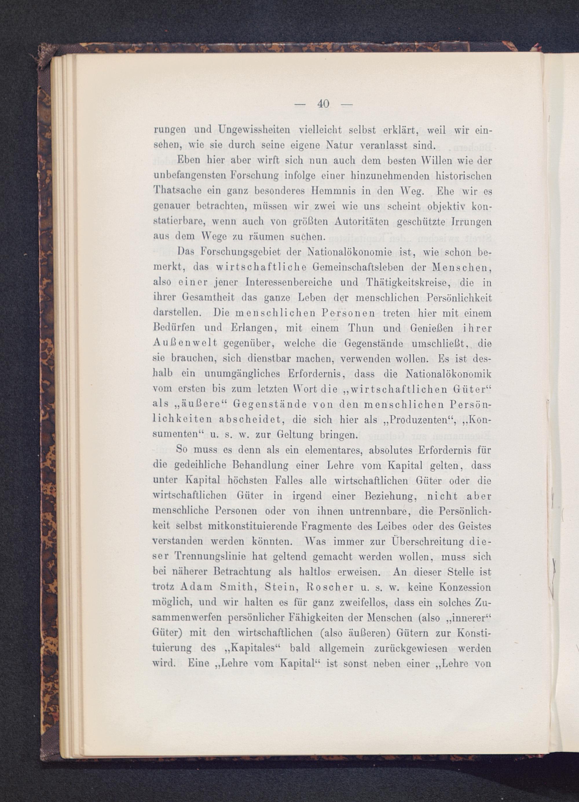 So muss es denn als ein elementares, absolutes Erfordernis fürdie gedeihliche Behandlung einer Lehre vom Kapital gelten, dassunter Kapital höchsten Falles alle wirtschaftlichen Güter oder diewirtschaftlichen Güter in irgend einer Beziehung, nicht abermenschliche Personen oder von ihnen untrennbare, die Persönlich-keit selbst mitkonstituierende Fragmente des Leibes oder des Geistesverstanden werden könnten. Was immer zur Überschreitung die-ser Trennungslinie hat geltend gemacht werden wollen, muss sichbei näherer Betrachtung als haltlos erweisen. An dieser Stelle isttrotz Adam Smith , Stein, Roscher u. s. w. keine Konzessionmöglich, und wir halten es für ganz zweifellos, dass ein solches Zu-sammenwerfen persönlicher Fähigkeiten der Menschen (also „innerer“Güter) mit den wirtschaftlichen (also äußeren) Gütern zur Konsti-tuierung des „Kapitales“ bald allgemein zurückgewiesen werdenwird. Eine „Lehre vom Kapital“ ist sonst neben einer „Lehre von