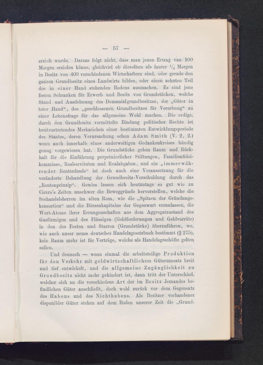 erzielt wurde. Daraus folgt nicht, dass man jenen Ertrag von 100Morgen erzielen könne, gleichviel ob dieselben als lauter l / i Morgenin Besitz von 400 verschiedenen Wirtschaftern sind, oder gerade denganzen Grundbesitz eines Landwirts bilden, oder einen zehnten Teildes in einer Hand stehenden Bodens ausmachen. Es sind jenefesten Schranken für Erwerb und Besitz von Grundstücken, welcheStand und Ausdehnung des Domanialgrundbositzcs, der „Güter intoter Hand“, des „geschlossenen Grundbesitzes für Vererbung“ zueiner Lebensfrage für das allgemeine Wohl machen. Die erdige,durch den Grundbesitz vermittelte Bindung politischer Rechte istbreitvortreteudes Merkzeichen einer bestimmten Entwicklungsperiododes Staates, deren Verursachung schon Adam Smith (V. 2, 2.)wenn auch innerhalb eines anderweitigen Gedankenkreises bündiggenug vorgewiesen hat. Die Grundstücke geben Raum und Rück-halt für die Einführung perpetuierlicher Stiftungen, Familienfidei-kommisse, Realservituten und Realabgaben, und ein „immerwäh-render Rentenfonds“ ist doch auch eine Voraussetzung für dieveränderte Behandlung der Grundbesitz-Verschuldung durch das„Rentenprinzip“. Gewiss lassen sich heutzutage so gut wie zuCicero’s Zeiten unschwer die Beweggründe hervorstellen, welche dieScehandelsherren im alten Rom, wie die „Spitzen der Gründungs-konsortien“ und die Börsenkapitaine der Gegenwart veranlassen, die'Wert-Atome ihrer Errungenschaften aus dem Aggregatzustand desGasförmigen und des Flüssigen (Geldforderungen und Geldvorräte)in den des Festen und Starren (Grundstücke) überzuführen, wo,wie auch unser neues deutsches Handelsgesetzbuch bestimmt (§ 275),kein Raum mehr ist für Verträge, welche als Handelsgeschäfte geltensollen.