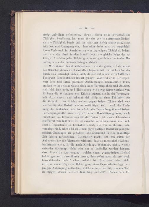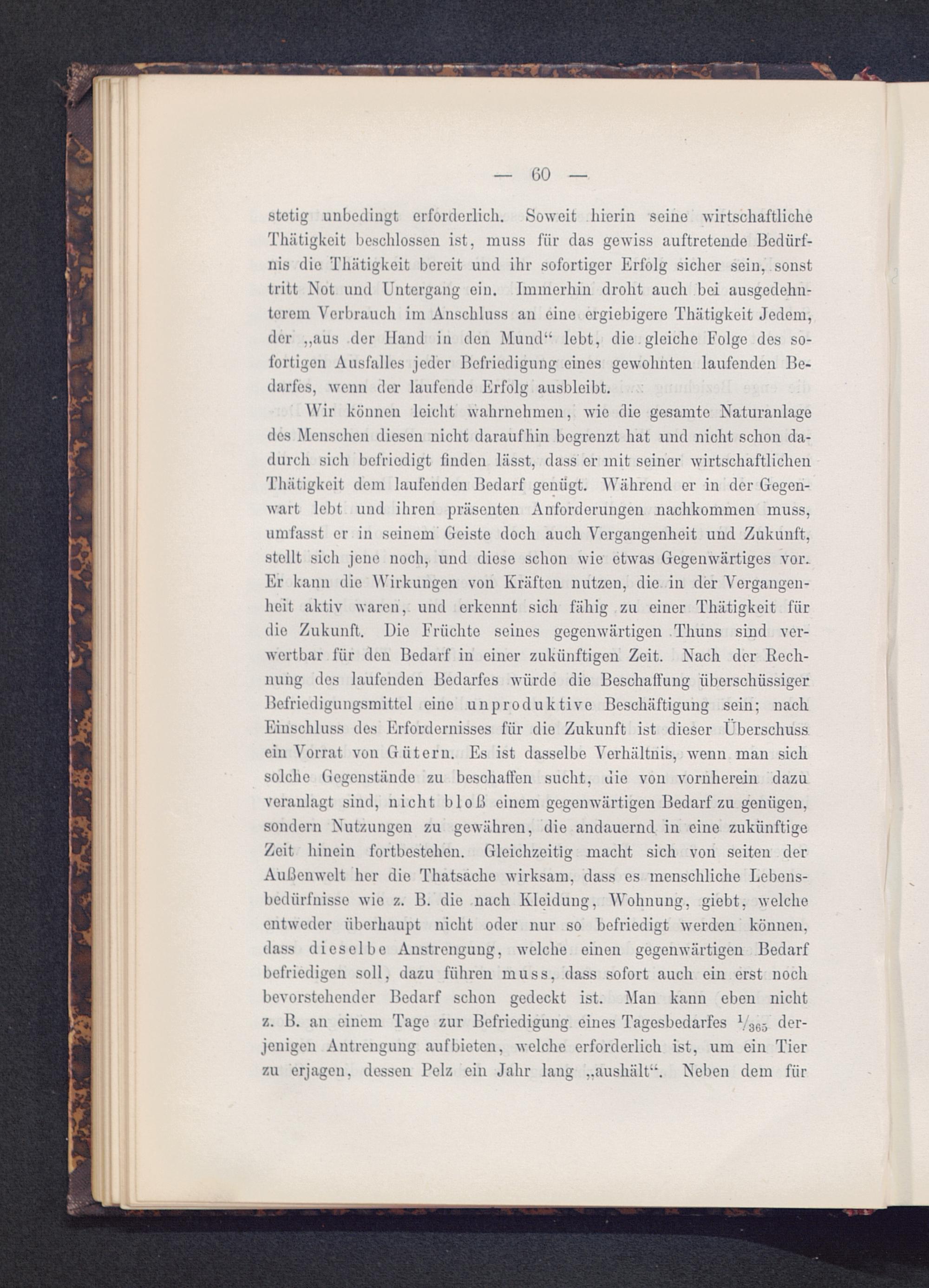 Wir können leicht wahrnehmen, wie die gesamte Naturanlagedes Menschen diesen nicht daraufhin begrenzt hat und nicht schon da-durch sich befriedigt finden lässt, dass er mit seiner wirtschaftlichenThätigkeit dem laufenden Bedarf genügt. Während er in der Gegen-wart lebt und ihren präsenten Anforderungen nachkommeu muss,umfasst er in seinem Geiste doch auch Vergangenheit und Zukunft,stellt sich jene noch, und diese schon wie etwas Gegenwärtiges vor.Er kann die Wirkungen von Kräften nutzen, die in der Vergangen-heit aktiv waren, und erkennt sich fähig zu einer Thätigkeit fürdie Zukunft. Die Früchte seines gegenwärtigen Thuns sind ver-wertbar für den Bedarf in einer zukünftigen Zeit. Nach der Rech-nung des laufenden Bedarfes würde die Beschaffung überschüssigerBefriedigungsmittel eine unproduktive Beschäftigung sein; nachEinschluss des Erfordernisses für die Zukunft ist dieser Überschussein Vorrat von Gütern. Es ist dasselbe Verhältnis, wenn man sichsolche Gegenstände zu beschaffen sucht, die von vornherein dazuveranlagt sind, nicht bloß einem gegenwärtigen Bedarf zu genügen,sondern Nutzungen zu gewähren, die andauernd in eine zukünftigeZeit hinein fortbestehen. Gleichzeitig macht sich von seiten derAußenwelt her die Thatsacho wirksam, dass es menschliche Lebens-bedürfnisse wio z. B. die nach Kleidung, Wohnung, giebt, welcheentweder überhaupt nicht oder nur so befriedigt werden können,dass dieselbe Anstrengung, welche einen gegenwärtigen Bedarfbefriedigen soll, dazu führen muss, dass sofort auch ein erst nochbevorstehender Bedarf schon gedeckt ist. Man kann eben nichtz. B. an einem Tage zur Befriedigung eines Tagesbedarfes !/ 3 65 der-jenigen Autrenguug auf bieten, welche erforderlich ist, um ein Tierzu erjagen, dessen Pelz ein Jahr laug „aushält“. Neben dem fiir