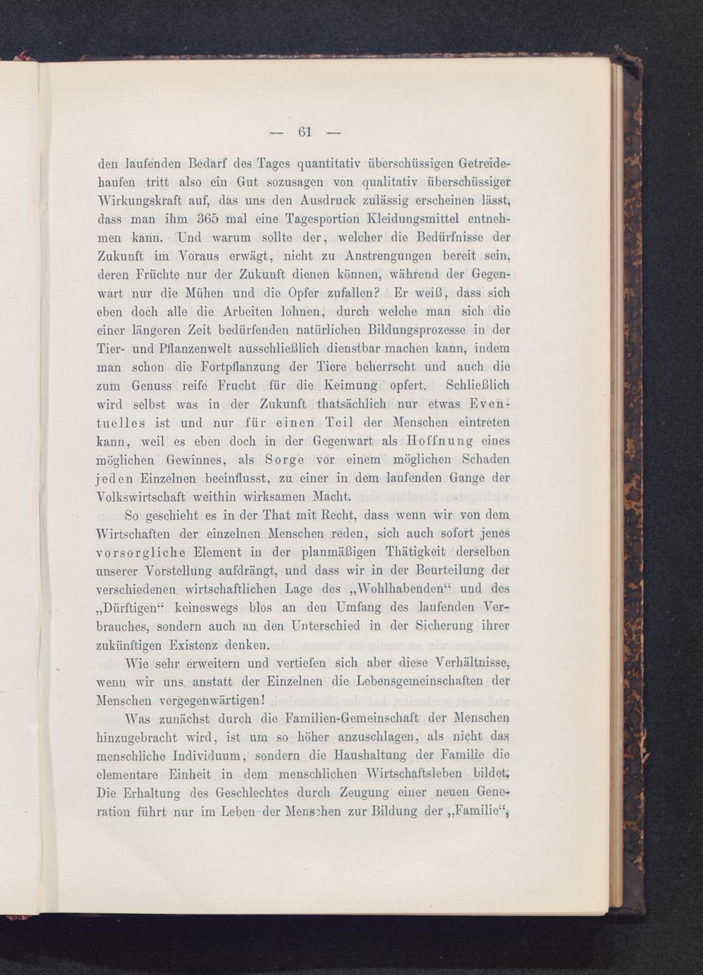 Was zunächst durch die Familien-Gemeinschaft der Menschenhinzugebracht wird, ist um so höher anzuschlagen, als nicht dasmenschliche Individuum, sondern die Haushaltung der Familie dieelementare Einheit in dem menschlichen Wirtschaftsleben bildet.Die Erhaltung des Geschlechtes durch Zeugung einer neuen Gene-ration führt nur im Leben der Menschen zur Bildung der „Familie“,