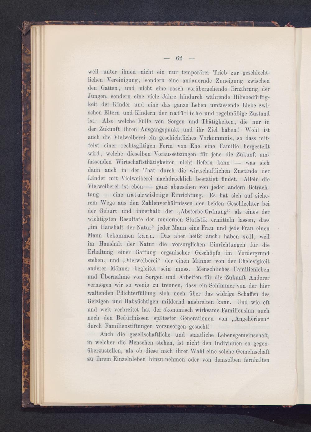 weil unter ihnen nicht ein nur temporärer Trieb zur geschlecht-lichen Vereinigung, sondern eine andauernde Zuneigung zwischenden Gatten, und nicht eine rasch vorübergehende Ernährung derJungen, sondern eine viele Jahre hindurch währende Hilfsbedürftig-keit dor Kinder und eine das ganze Leben umfassende Liebe zwi-schen Eltern und Kindern der natürliche und regelmäßige Zustandist. Also welche Fülle von Sorgen und Thätigkeiten, die nur inder Zukunft ihren Ausgangspunkt und ihr Ziel haben! Wohl istauch die Vielweiberei ein geschichtliches Vorkommnis, so dass mit-telst einer rechtsgiltigen Form von Ehe eine Familie hergestelltwird, welche dieselben Voraussetzungen für jene die Zukunft um-fassenden Wirtschaftstätigkeiten nicht liefern kann — was sichdann auch in der That durch die wirtschaftlichen Zustände derLänder mit Vielweiberei nachdrücklich bestätigt findet. Allein dieVielweiberei ist eben — ganz abgesehen von jeder andern Betrach-tung — eine naturwidrige Einrichtung. Es hat sich auf siche-rem Wege aus den Zahlenverhältnissen der beiden Geschlechter beider Geburt und innerhalb der „Absterbe-Ordnung“ als eines derwichtigsten Resultate der modernen Statistik ermitteln lassen, dass„im Haushalt der Natur“ jeder Mann eine Frau und jede Frau einenMann bekommen kann. Das aber heißt auch: haben soll, weilim Haushalt der Natur die vorsorglichen Einrichtungen für dieErhaltung einer Gattung organischer Geschöpfe im Vordergrundstehen, und „Vielweiberei“ der einen Männer von der Ehelosigkeitanderer Männer begleitet sein muss. Menschliches Familienlebenund Übernahme von Sorgen und Arbeiten für die Zukunft Anderervermögen wir so wenig zu trennen, dass ein Schimmer von der hierwaltenden Pilichterfüllung sich noch über das wddrige Schaffen desGeizigen und Habsüchtigen mildernd ausbreiten kann. Und wie oftund weit verbreitet hat der ökonomisch wirksame Familiensinn auchnoch den Bedürfnissen spätester Generationen von „Angehörigen “durch Familienstiftungen vorzusorgen gesucht!