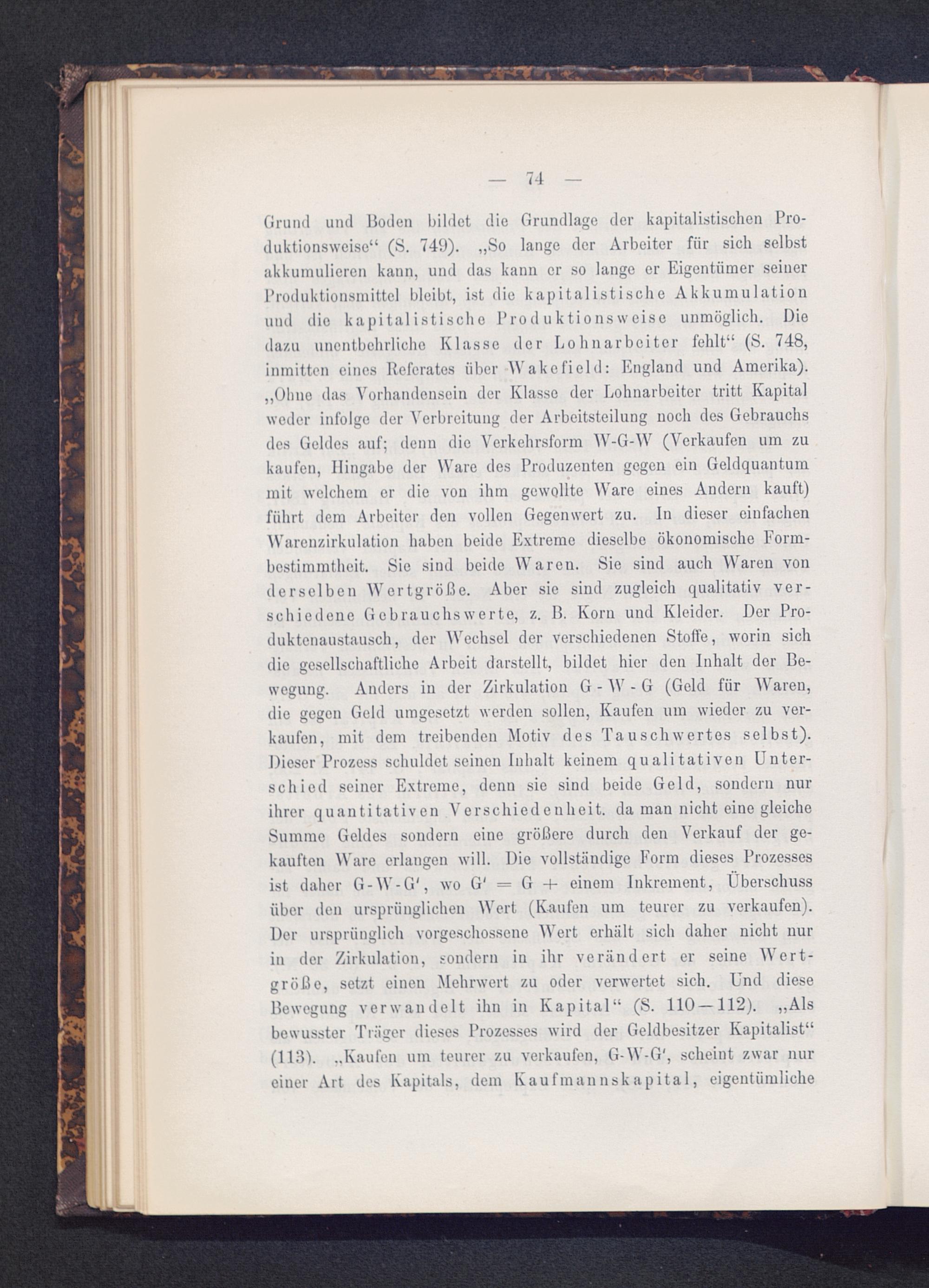 Grund und Boden bildet die Grundlage der kapitalistischen Pro-duktionsweise“ (S. 749). „So lange der Arbeiter für sich selbstakkumulieren kann, und das kann er so lange er Eigentümer seinerProduktionsmittel bleibt, ist die kapitalistische Akkumulationund dio kapitalistische Produktionsweise unmöglich. Diedazu unentbehrliche Klasse der Lohnarbeiter fehlt“ (S. 748,inmitten eines Referates über Wakefield: England und Amerika). „Ulme das Vorhandensein der Klasse der Lohnarbeiter tritt Kapitalweder infolge der Verbreitung der Arbeitsteilung noch des Gebrauchsdes Geldes auf; denu dio Verkehrsform W-G-W (Verkaufen um zukaufen, Hingabe der Ware des Produzenten gegen ein Geldquantummit welchem er die von ihm gewollte Ware eines Andern kauft)führt dem Arbeiter den vollen Gegenwert zu. In dieser einfachenWarenzirkulation haben beide Extreme dieselbe ökonomische Foirn-bcstimmtheit. Sie sind beide Waren. Sie sind auch Waren vonderselben Wertgröße. Aber sie sind zugleich qualitativ ver-schiedene Gebrauchswerte, z. B. Korn und Kleider. Der Pro-duktenaustausch, der Wechsel der verschiedenen Stoffe, worin sichdie gesellschaftliche Arbeit darstellt, bildet hier den Inhalt der Be-wegung. Anders in der Zirkulation G - W - G (Geld für Waren,die gegen Geld umgesetzt werden sollen, Kaufen um wieder zu ver-kaufen, mit dem treibenden Motiv des Tauschwertes selbst).Dieser Prozess schuldet seinen Inhalt keinem qualitativen Unter-schied seiner Extreme, denu sie sind beide Geld, sondern nurihrer quantitativen Verschiedenheit, da man nicht eine gleicheSumme Geldes sondern eine größere durch den Verkauf der ge-kauften Ware erlangen will. Die vollständige Form dieses Prozessesist daher G-W-G', wo G' = G 4- einem Inkrement, Überschussüber den ursprünglichen Wert (Kaufen um teurer zu verkaufen).Der ursprünglich vorgeschossene Wert erhält sich daher nicht nurin der Zirkulation, sondern in ihr verändert er seine AVert-größe, setzt einen Mehrwert zu oder verwertet sich. Und dieseBewegung verwandelt ihn in Kapital“ (S. 110 —112). „Alsbewusster Träger dieses Prozesses wird der Geldbesitzer Kapitalist“(113). ..Kaufen um teurer zu verkaufen, G-W-G', scheint zwar nureiner Art des Kapitals, dem Kaufmannskapital, eigentümliche