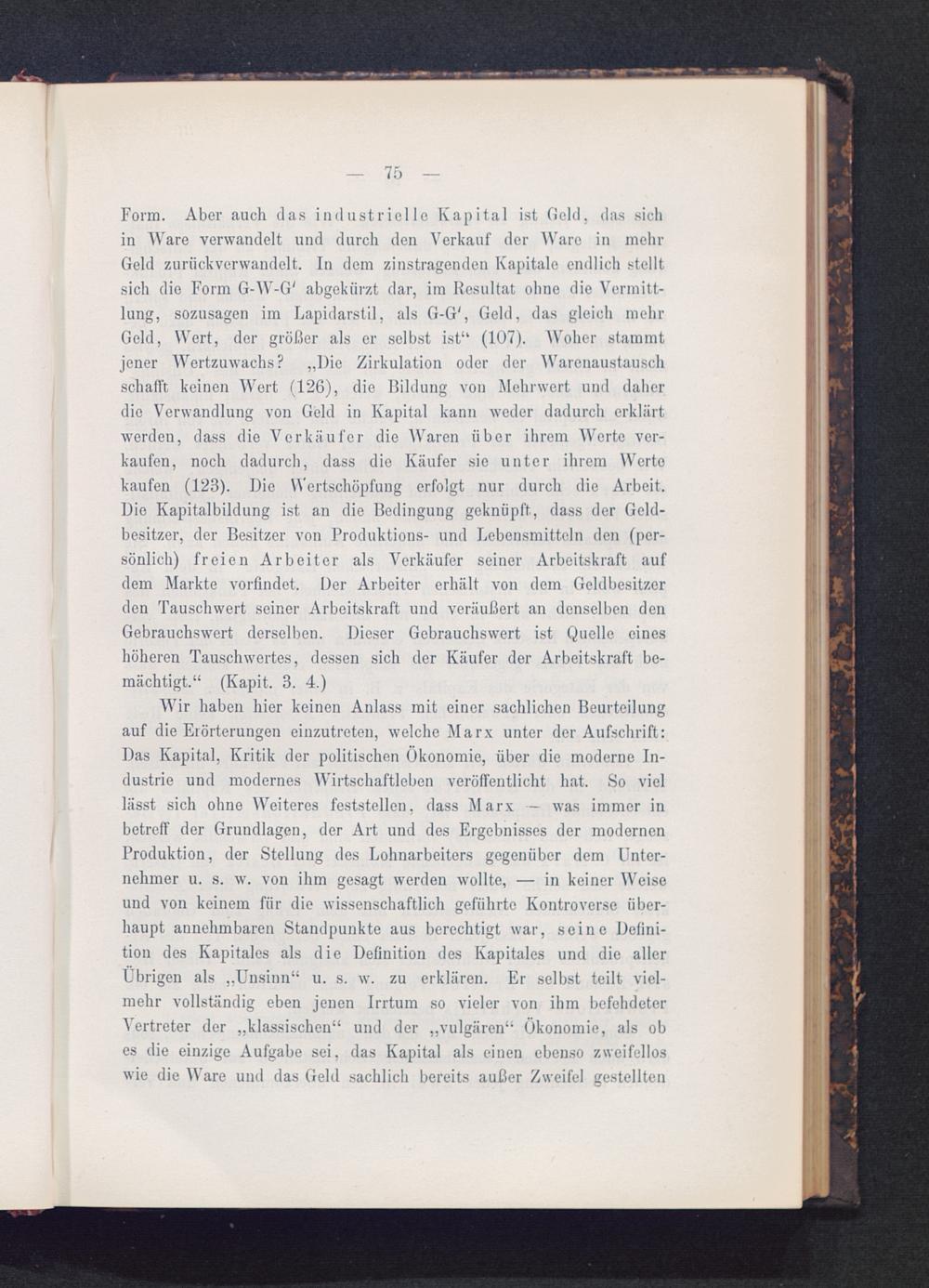 Wir haben hier keinen Anlass mit einer sachlichen Beurteilungauf die Erörterungen einzutreten, welche Marx unter der Aufschrift:Das Kapital, Kritik der politischen Ökonomie, über die moderne In-dustrie und modernes Wirtschaftleben veröffentlicht hat. So viellässt sich ohne Weiteres feststellen, dass Marx — was immer inbetreff der Grundlagen, der Art und des Ergebnisses der modernenProduktion, der Stellung des Lohnarbeiters gegenüber dem Unter-nehmer u. s. w. von ihm gesagt werden wollte, — in keiner Weiseund von keinem für die wissenschaftlich geführte Kontroverse über-haupt annehmbaren Standpunkte aus berechtigt war, seine Defini-tion des Kapitales als die Definition des Kapitales und die allerÜbrigen als „Unsinn“ u. s. w. zu erklären. Er selbst teilt viel-mehr vollständig eben jenen Irrtum so vieler von ihm befehdeterVertreter der „klassischen“ und der „vulgären“ Ökonomie, als obes die einzige Aufgabe sei, das Kapital als einen ebenso zweifelloswie die Ware und das Geld sachlich bereits außer Zweifel gestellten
