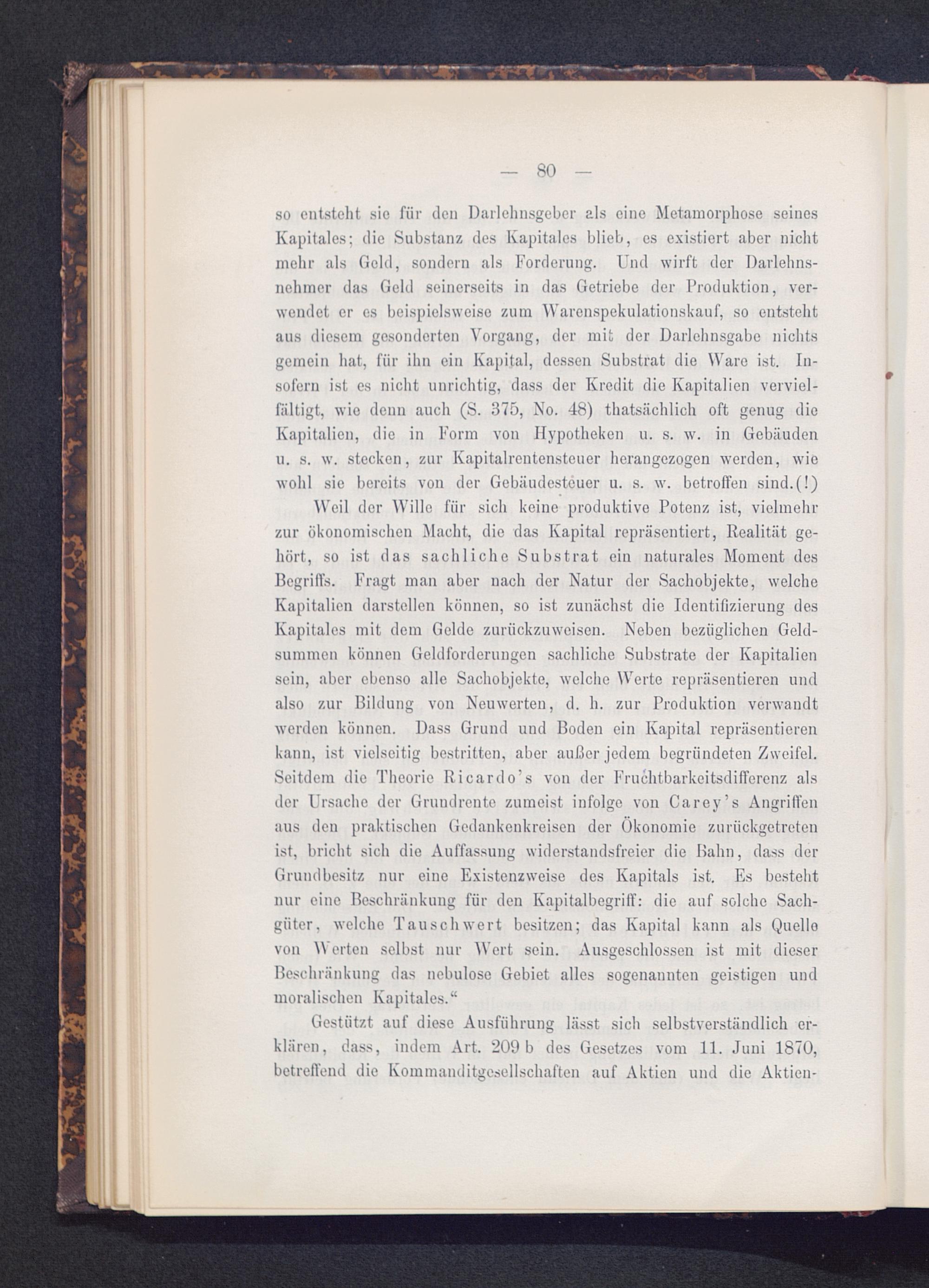 so entsteht sie für den Darlehnsgeber als eine Metamorphose seinesKapitales; die Substanz des Kapitales blieb, es existiert aber nichtmehr als Geld, sondern als Forderung. Und wirft der Darlehns-nehmer das Geld seinerseits in das Getriebe der Produktion, ver-wendet er es beispielsweise zum Warenspekulationskauf, so entstehtaus diesem gesonderten Vorgang, der mit der Darlehnsgabe nichtsgemein hat, für ihn ein Kapital, dessen Substrat die Ware ist. In-sofern ist es nicht unrichtig, dass der Kredit die Kapitalien verviel-fältigt, wie denn auch (S. 375, No. 48) thatsächlich oft genug dieKapitalien, die in Form von Hypotheken u. s. w. in Gebäudenu. s. w. stecken, zur Kapitalrentensteuer herangezogen werden, wiewohl sie bereits von der Gebäudestcuer u. s. w. betroffen sind. (!)