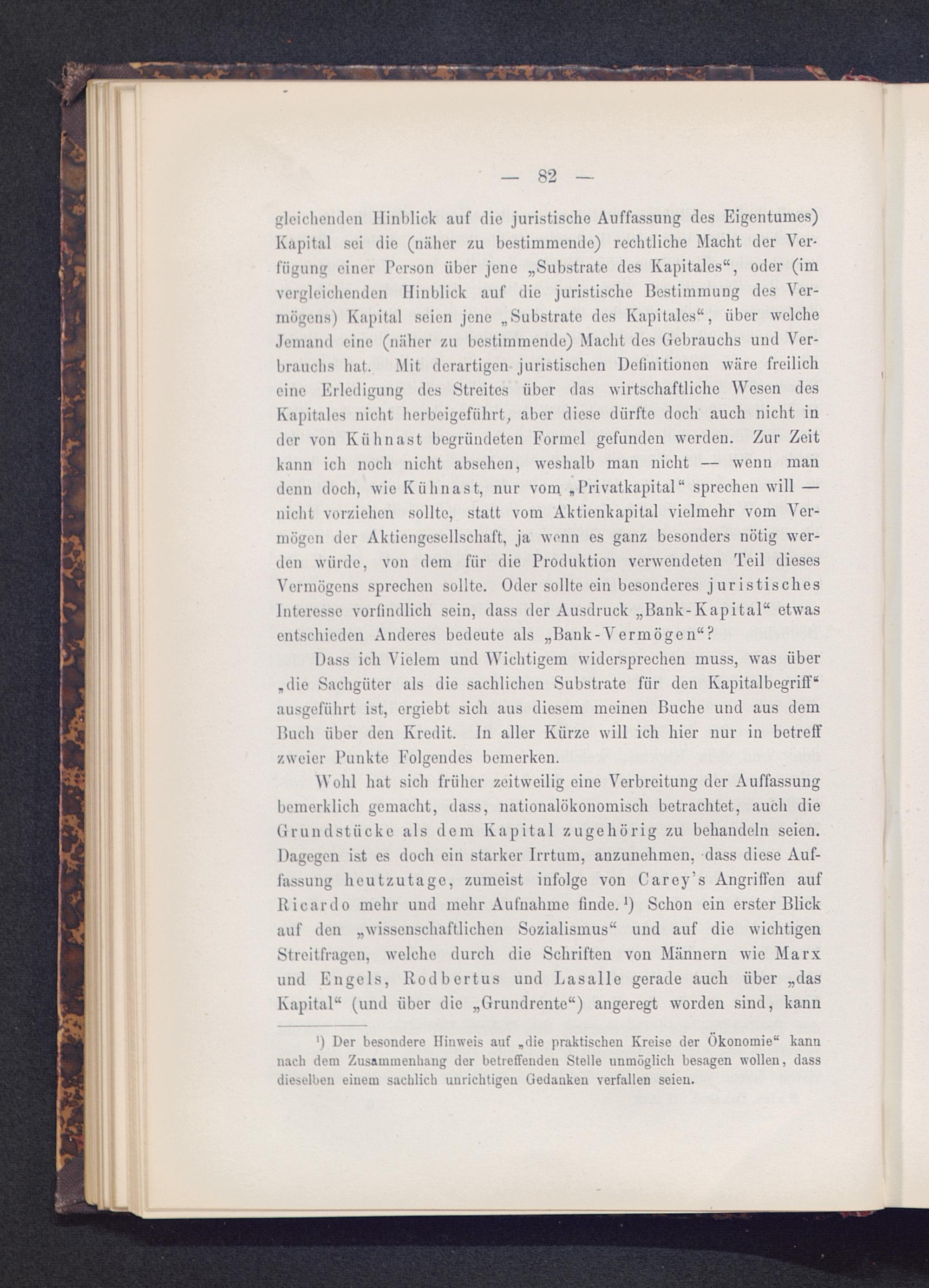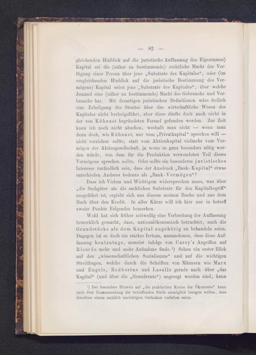 Wohl hat sich früher zeitweilig eine Verbreitung der Auffassungbemerklich gemacht, dass, nationalökonomisch betrachtet, auch dieGrundstücke als dem Kapital zugehörig zu behandeln seien.Dagegen ist es doch ein starker Irrtum, anzunehmen, dass diese Auf-fassung heutzutage, zumeist infolge von Carey’s Angriffen aufRicardo mehr und mehr Aufnahme finde. 1 ) Schon ein erster Blickauf den „wissenschaftlichen Sozialismus“ und auf die wichtigenStreitfragen, welche durch die Schriften von Männern wie Marx und Engels, Rodbertus und Lasalle gerade auch über „dasKapital“ (und über die „Grundrente“) angeregt worden sind, kann