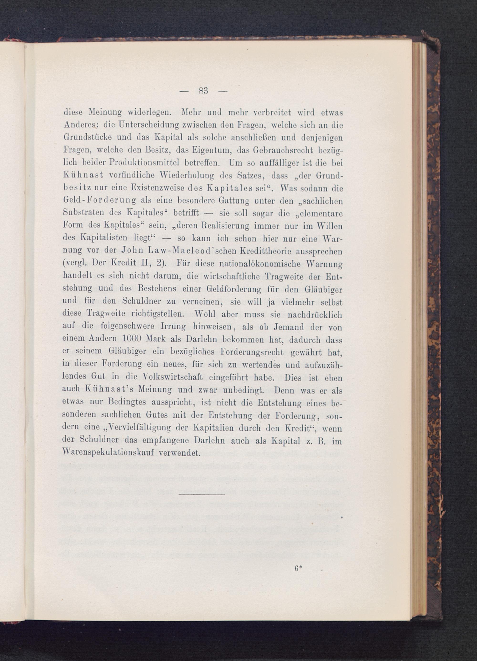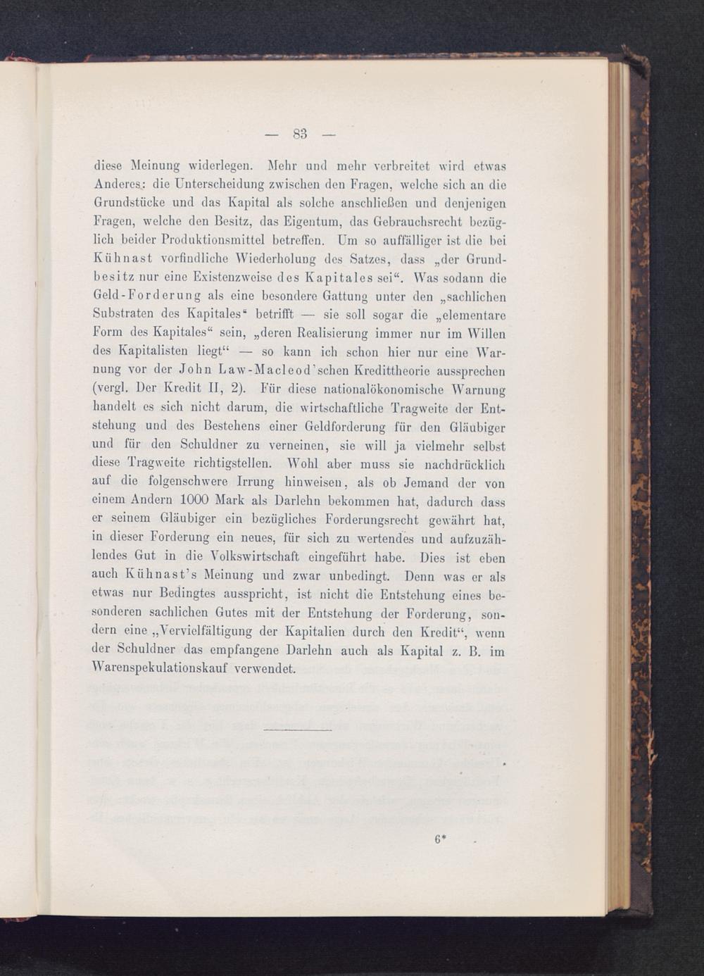 diese Meinung widerlegen. Mehr und mehr verbreitet wird etwasAnderes: die Unterscheidung zwischen den Fragen, welche sich an dieGrundstücke und das Kapital als solche anschließen und denjenigenFragen, welche den Besitz, das Eigentum, das Gebrauchsrecht bezüg-lich beider Produktionsmittel betreffen. Um so auffälliger ist die beiKühnast vorfindliche Wiederholung des Satzes, dass „der Grund-besitz nur eine Existenzweisc des Kapitales sei“. Was sodann dieGeld-Forderung als eine besondere Gattung unter den „sachlichenSubstraten des Kapitales“ betrifft — sie soll sogar die „elementareForm des Kapitales“ sein, „deren Realisierung immer nur im Willendes Kapitalisten liegt“ — so kann ich schon hier nur eine War-nung vor der John Law-Macleod’schen Kredittheorie aussprechen(vergl. Der Kredit II, 2). Für diese nationalökonomische Warnunghandelt es sich nicht darum, die wirtschaftliche Tragweite der Ent-stehung und des Bestehens einer Geldforderung für den Gläubigerund für den Schuldner zu verneinen, sie will ja vielmehr selbstdiese Tragweite richtigstellen. Wohl aber muss sie nachdrücklichauf die folgenschwere Irrung hinweisen, als ob Jemand der voneinem Andern 1000 Mark als Darlehn bekommen hat, dadurch dasser seinem Gläubiger ein bezügliches Forderungsrecht gewährt hat,in dieser Forderung ein neues, für sich zu wertendes und aufzuzäh-lendes Gut in die Volkswirtschaft eingeführt habe. Dies ist ebenauch Kiihnast’s Meinung und zwar unbedingt. Denn was er alsetwas nur Bedingtes ausspricht, ist nicht die Entstehung eines be-sonderen sachlichen Gutes mit der Entstehung der Forderung, son-dern eine „Vervielfältigung der Kapitalien durch den Kredit“, wennder Schuldner das empfangene Darlehn auch als Kapital z. B. imWarenspekulationskauf verwendet.