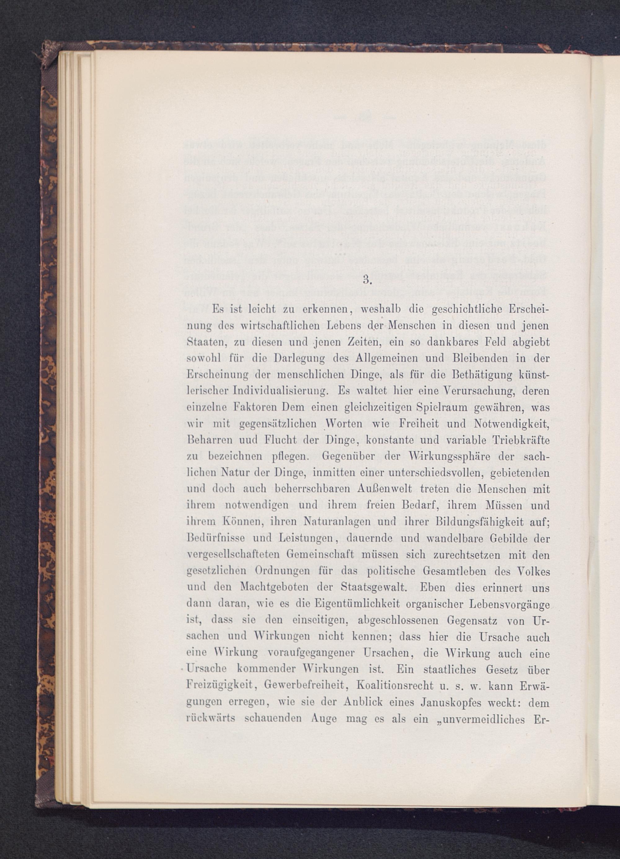 Es ist leicht zu erkennen, weshalb die geschichtliche Erschei-nung des wirtschaftlichen Lebens d.er Menschen in diesen und jenenStaaten, zu diesen und jenen Zeiten, ein so dankbares Feld abgiebtsowohl für die Darlegung des Allgemeinen und Bleibenden in derErscheinung der menschlichen Dinge, als für die Bethätigung künst-lerischer Individualisierung. Es waltet hier eine Verursachung, dereneinzelne Faktoren Dem einen gleichzeitigen Spielraum gewähren, waswir mit gegensätzlichen Worten wie Freiheit und Notwendigkeit,Beharren uud Flucht der Dinge, konstante und variable Triebkräftezu bezeichnen pflegen. Gegenüber der Wirkungssphäre der sach-lichen Natur der Dinge, inmitten einer unterschiedsvollen, gebietendenund doch auch beherrschbaren Außenwelt treten die Menschen mitihrem notwendigen und ihrem freien Bedarf, ihrem Müssen undihrem Können, ihren Naturanlagen uud ihrer Bildungsfähigkeit auf;Bedürfnisse und Leistungen, dauernde und wandelbare Gebilde dervergesellschafteten Gemeinschaft müssen sich zurechtsetzen mit dengesetzlichen Ordnungen für das politische Gesamtleben des Volkesund den Machtgeboten der Staatsgewalt. Eben dies erinnert unsdann daran, wie es die Eigentümlichkeit organischer Lebensvorgängeist, dass sie den einseitigen, abgeschlossenen Gegensatz von Ur-sachen und Wirkungen nicht kennen; dass hier die Ursache aucheine Wirkung voraufgegangener Ursachen, die Wirkung auch eineUrsache kommender Wirkungen ist. Ein staatliches Gesetz überFreizügigkeit, Gewerbefreiheit, Koalitionsrecht u. s. w. kann Erwä-gungen erregen, wie sie der Anblick eines Januskopfes weckt: demrückwärts schauenden Auge mag es als ein „unvermeidliches Er-