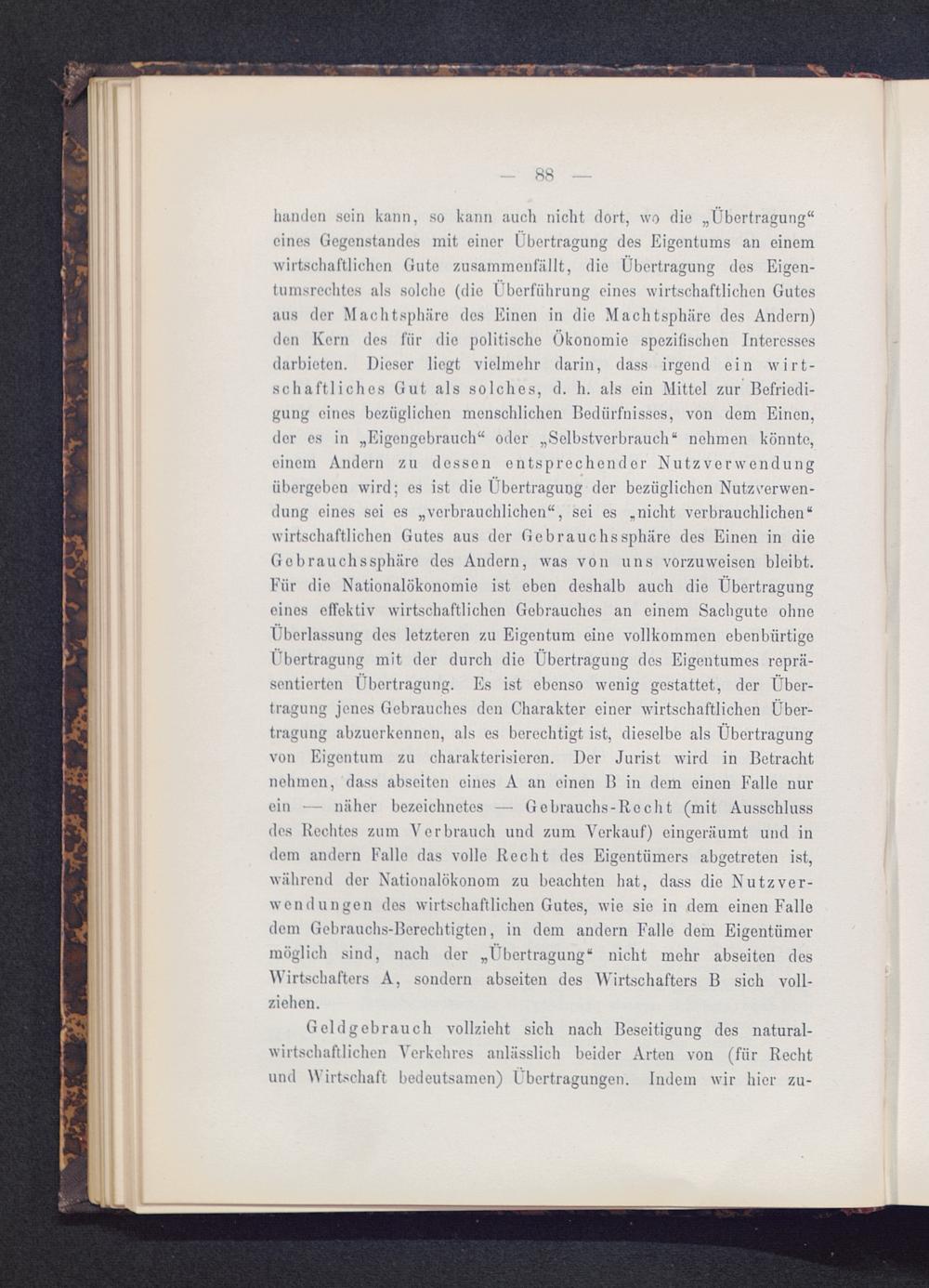 hiindon sein kann, so kann auch nicht dort, wo die „Übertragung“eines Gegenstandes mit einer Übertragung des Eigentums an einemwirtschaftlichen Gute zusammenfällt, die Übertragung des Eigen-tumsrechtes als solche (die Überführung eines wirtschaftlichen Gutesaus der Machtsphäre des Einen in die Machtsphäre des Andern)den Kern des fiir die politische Ökonomie spezifischen Interessesdarbieten. Dieser liegt vielmehr darin, dass irgend ein wirt-schaftliches Gut als solches, d. h. als ein Mittel zur Befriedi-gung eines bezüglichen menschlichen Bedürfnisses, von dem Einen,der es in „Eigengebrauch“ oder „Selbstverbrauch“ nehmen könnte,einem Andern zu dessen entsprechender Nutz Verwendungübergeben wird; es ist die Übertragung der bezüglichen Nutzverwen-dung eines sei es „verbrauchlichen“, sei es „nicht verbrauchlichen“wirtschaftlichen Gutes aus der Gebrauchs Sphäre des Einen in dieGobrauchssphiire des Andern, was von uns vorzuweisen bleibt.Für die Nationalökonomie ist eben deshalb auch die Übertragungeines effektiv wirtschaftlichen Gebrauches an einem Sachgute ohneÜberlassung des letzteren zu Eigentum eine vollkommen ebenbürtigeÜbertragung mit der durch die Übertragung des Eigentumes reprä-sentierten Übertragung. Es ist ebenso wenig gestattet, der Über-tragung jenes Gebrauches den Charakter einer wirtschaftlichen Über-tragung abzuerkennen, als es berechtigt ist, dieselbe als Übertragungvon Eigentum zu charakterisieren. Der Jurist wird in Betrachtnehmen, dass abseiten eines A an einen B in dem einen Falle nurein — näher bezeichnetes — Gebrauchs-Recht (mit Ausschlussdes Rechtes zum Verbrauch und zum Verkauf) eingeräumt und indem andern Falle das volle Recht des Eigentümers abgetreten ist,während der Nationalökonom zu beachten hat, dass die Nutz ver-weil dun gen des wirtschaftlichen Gutes, wie sie in dem einen Falledom Gebrauchs-Bcrechtigten, in dem audern Falle dem Eigentümermöglich sind, nach der „Übertragung“ nicht mehr abseiten desWirtschafters A, sondern abseiten des Wirtschafters B sich voll-ziehen.
