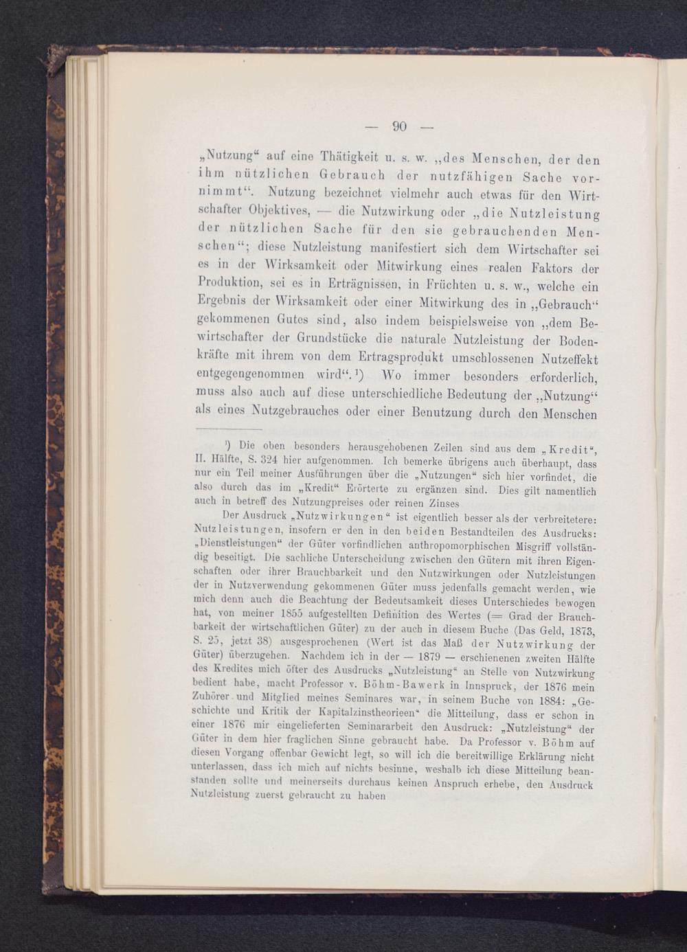 Der Ausdruck „Nutzwirkungen “ ist eigentlich besser als der verbreitetere:Nutzleistungen, insofern er den in den beiden Bestandteilen des Ausdrucks:„Dienstleistungen“ der Güter vorfindlichen anthropomorphischen Misgriff vollstän-dig beseitigt. Die sachliche Unterscheidung zwischen den Gütern mit ihren Eigen-schaften oder ihrer Brauchbarkeit und den Nutzwirkungen oder Nutzleistungender in Nutzverwendung gekommenen Güter muss jedenfalls gemacht werden, wiemich denn auch die Beachtung der Bedeutsamkeit dieses Unterschiedes bewogenhat, von meiner 1855 aufgestellten Definition des Wertes (= Grad der Brauch-barkeit der wirtschaftlichen Güter) zu der auch in diesem Buche (Das Geld, 1873,S. 25, jetzt 38) ausgesprochenen (Wert ist das Maß der Nutzwirkung derGüter) überzugehen. Nachdem ich in der — 1879 — erschienenen zweiten Hälftedes Kredites mich öfter des Ausdrucks „Nutzleistung“ an Stelle von Nutzwirkungbedient habe, macht Professor v. Böhm-Bawerk in Innspruck, der 1876 meinZuhörer und Mitglied meines Seminares war, in seinem Buche von 1884: „Ge-schichte und Kritik der Kapitalzinstheorieen“ die Mitteilung, dass er schon ineiner 1876 mir eingelieferten Seminararbeit den Ausdruck: „Nutzleistung“ derGüter in dem hier fraglichen Sinne gebraucht habe. Da Professor v. Böhm aufdiesen Vorgang offenbar Gewicht legt, so will ich die bereitwillige Erklärung nichtunterlassen, dass ich mich auf nichts besinne, weshalb ich diese Mitteilung bean-standen sollte und meinerseits durchaus keinen Anspruch erhebe, den AusdruckNutzleistung zuerst gebraucht zu haben