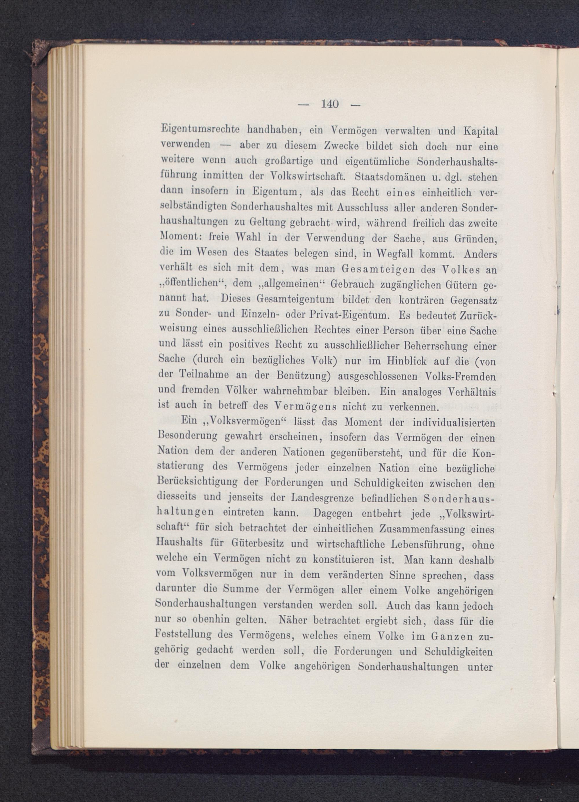 Eigentumsrechte handhaben, ein Vermögen verwalten und Kapitalverwenden — aber zu diesem Zwecke bildet sich doch nur eineweitere wenn auch großartige und eigentümliche Sonderhaushalts-führung inmitten der Volkswirtschaft. Staatsdomänen u. dgl. stehendann insofern in Eigentum, als das Recht einos einheitlich ver-selbständigten Sonderhaushaltes mit Ausschluss aller anderen Sonder-haushaltungen zu Geltung gebracht wird, während freilich das zweiteMoment: freie Wahl in der Verwendung der Sache, aus Gründen,die im Wesen des Staates belegen sind, in Wegfall kommt. Andersverhält es sich mit dem, was man Gesamteigen des Volkes an„öffentlichen“, dem „allgemeinen“ Gebrauch zugänglichen Gütern ge-nannt hat. Dieses Gesamteigentum bildet den konträren Gegensatzzu Sonder- und Einzeln- oder Privat-Eigentum. Es bedeutet Zurück-weisung eines ausschließlichen Rechtes einer Person über eine Sacheund lässt ein positives Recht zu ausschließlicher Beherrschung einerSache (durch ein bezügliches Volk) nur im Hinblick auf die (vonder Teilnahme an der Benützung) ausgeschlossenen Volks-Fremdenund fremden Völker wahrnehmbar bleiben. Ein analoges Verhältnisist auch in betreff des Vermögens nicht zu verkennen.