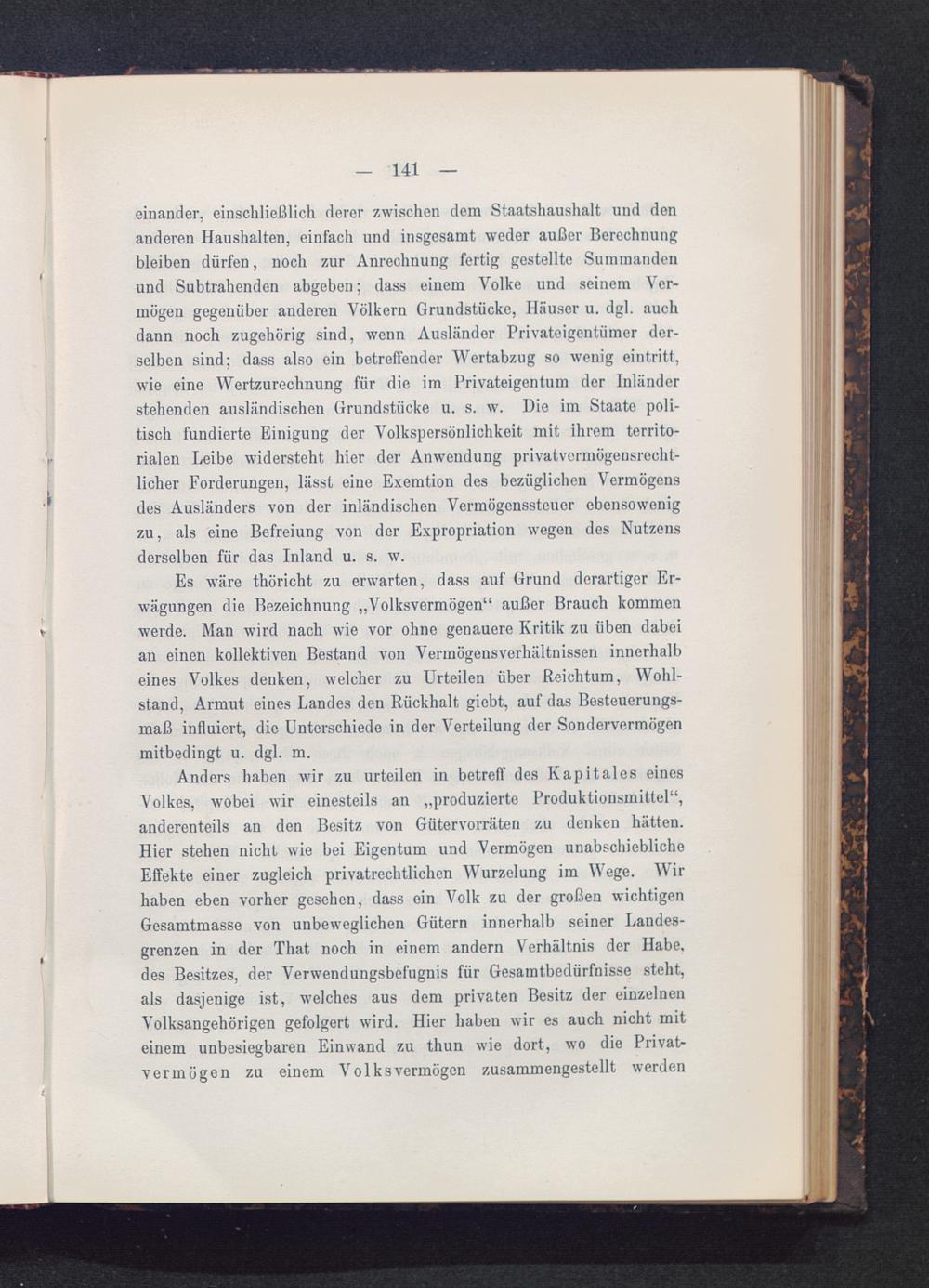 Anders haben wir zu urteilen in betreff des Kapitales einesVolkes, wobei wir einesteils an „produzierte Produktionsmittel“,anderenteils an den Besitz von Gütervorräten zu denken hätten.Hier stehen nicht wie bei Eigentum und Vermögen unabschieblicheEffekte einer zugleich privatrechtlichen Wurzelung im Wege. Wirhaben eben vorher gesehen, dass ein Volk zu der großen wichtigenGesamtmasse von unbeweglichen Gütern innerhalb seiner Landes-grenzen in der That noch in einem andern Verhältnis der Habe,des Besitzes, der Verwendungsbefugnis für Gesamtbedürfnisse steht,als dasjenige ist, welches aus dem privaten Besitz der einzelnenVolksangehörigen gefolgert wird. Hier haben wir es auch nicht miteinem unbesiegbaren Einwand zu thun wie dort, wo die Privat-vermögen zu einem Volksvermögen zusammengestellt werden
