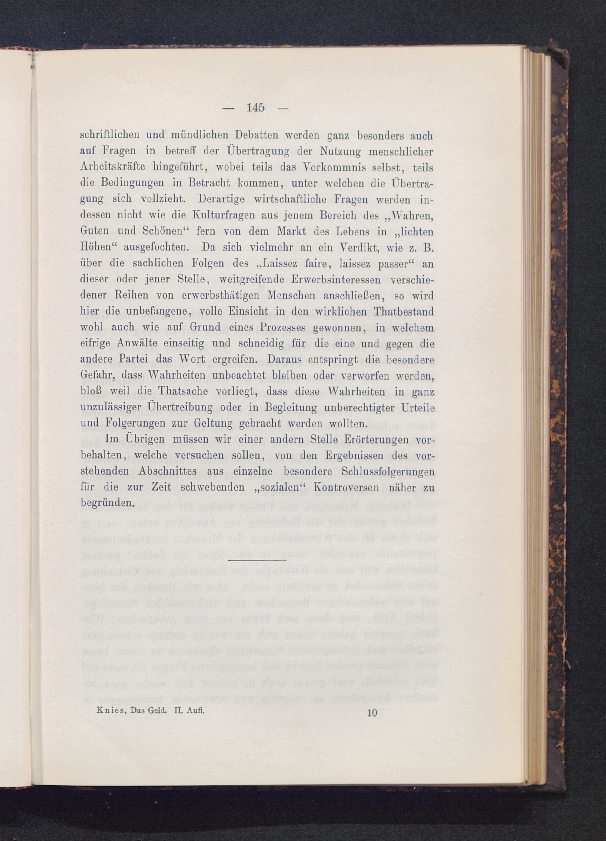 schriftlichen und mündlichen Debatten werden ganz besonders auchauf Fragen in betreff der Übertragung der Nutzung menschlicherArbeitskräfte hingeführt, wobei teils das Vorkommnis selbst, teilsdie Bedingungen in Betracht kommen, unter welchen die Übertra-gung sich vollzieht. Derartige wirtschaftliche Fragen werden in-dessen nicht wie die Kulturfragen aus jenem Bereich des „Wahren,Guten und Schönen“ fern von dem Markt des Lebens in „lichtenHöhen“ ausgefochten. Da sich vielmehr an ein Verdikt, wie z. B.über die sachlichen Folgen des „Laissez faire, laissez passer“ andieser oder jener Stelle, weitgreifende Erwerbsinteressen verschie-dener Reihen von erwerbsthätigen Menschen anschließen, so wirdhier die unbefangene, volle Einsicht in den wirklichen Thatbestandwohl auch wie auf Grund eines Prozesses gewonnen, in welchemeifrige Anwälte einseitig und schneidig für die eine und gegen dieandere Partei das Wort ergreifen. Daraus entspringt die besondereGefahr, dass Wahrheiten unbeachtet bleiben oder verworfen werden,bloß weil die Thatsache vorliegt, dass diese Wahrheiten in ganzunzulässiger Übertreibung oder in Begleitung unberechtigter Urteileund Folgerungen zur Geltung gebracht werden wollten.