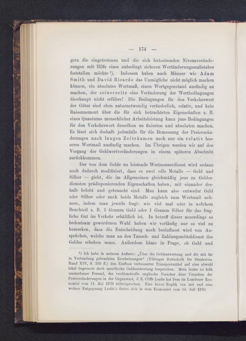 ') Ich habe in meinem Aufsatz: „Über die Geldentwertung und die mit ihrin Verbindung gebrachten Erscheinungen“ (Tübinger Zeitschrift für Staatswiss.Band XIV, S. 2G0 fl.) den Einfluss verbesserter Transportmittel auf eine obwohllokal begrenzte doch spezifische Geldentwertung besprochen. Mein leider so frühverstorbener Freund, der verdienstvolle englische Forscher über Ursachen derPreisveränderungen in der Gegenwart, J. E. Cliffe Leslie hat Dem ira Londoner Eco-nomist vom 14. Mai 1870 widersprochen. Eine kurze Replik von mir und eineweitere Entgegnung I.eslie's findet sich in dem Economist vom IG. Juli 1870.