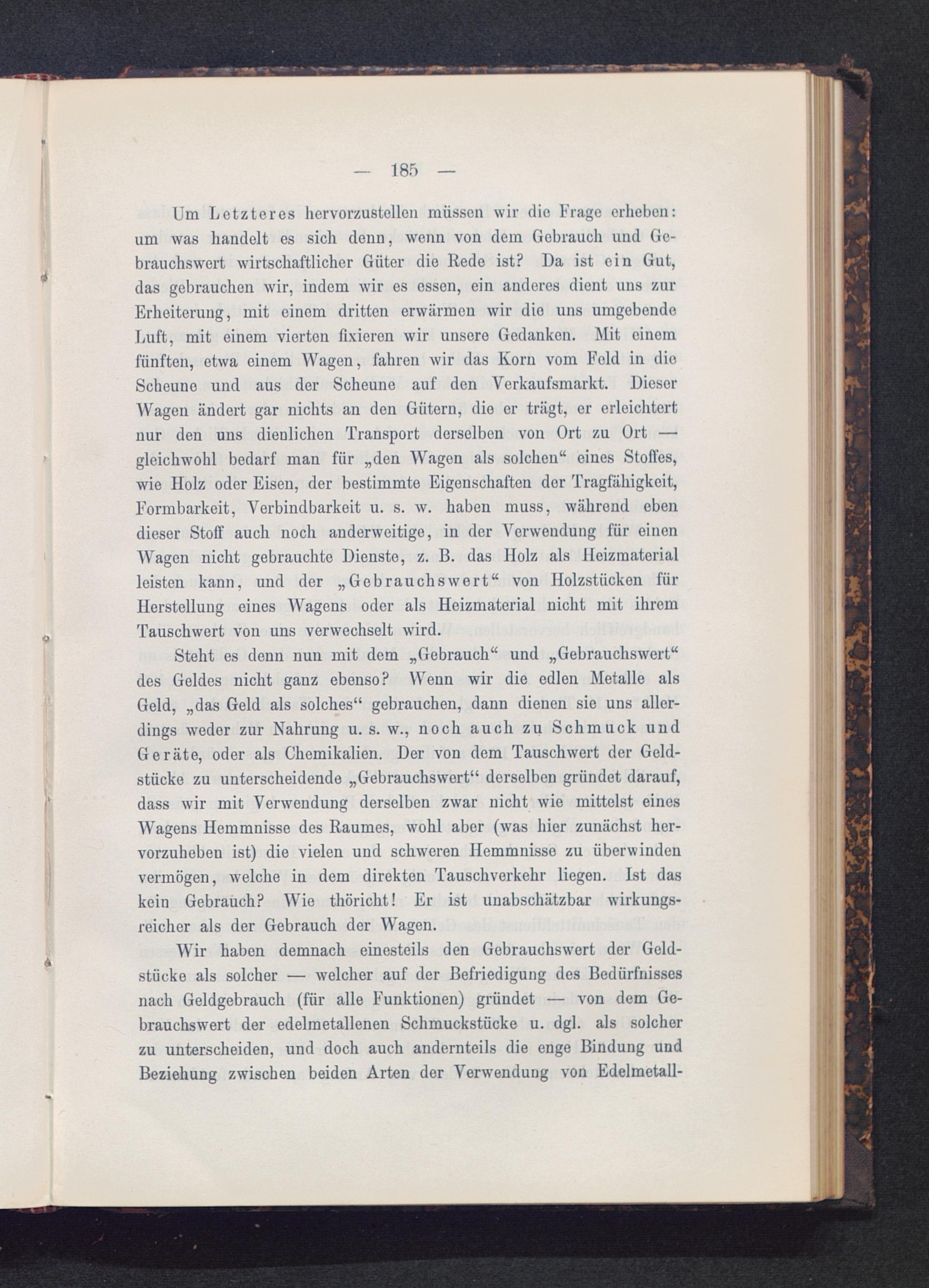 Um Letzteres hervorzustellen müssen wir die Frage erheben:um was handelt es sich denn, wenn von dem Gebrauch und Ge-brauchswert wirtschaftlicher Güter die Rede ist? Da ist ein Gut,das gebrauchen wir, indem wir es essen, ein anderes dient uns zurErheiterung, mit einem dritten erwärmen wir die uns umgebendeLuft, mit einem vierten fixieren wir unsere Gedanken. Mit einemfünften, etwa einem Wagen, fahren wir das Korn vom Feld in dioScheune und aus der Scheune auf den Verkaufsmarkt. DieserWagen ändert gar nichts an den Gütern, dio er trägt, er erleichtertnur den uns dienlichen Transport derselben von Ort zu Ort —gleichwohl bedarf man für „den Wagen als solchen“ eines Stoßes,wie Holz oder Eisen, der bestimmte Eigenschaften der Tragfähigkeit,Formbarkeit, Verbindbarkeit u. s. w. haben muss, während ebendieser Stoff auch noch anderweitige, in der Verwendung für einenWagen nicht gebrauchte Dienste, z. B. das Holz als Heizmaterialleisten kann, und der „Gebrauchswert“ von Holzstücken fürHerstellung eines Wagens oder als Heizmaterial nicht mit ihremTauschwert von uns verwechselt wird.