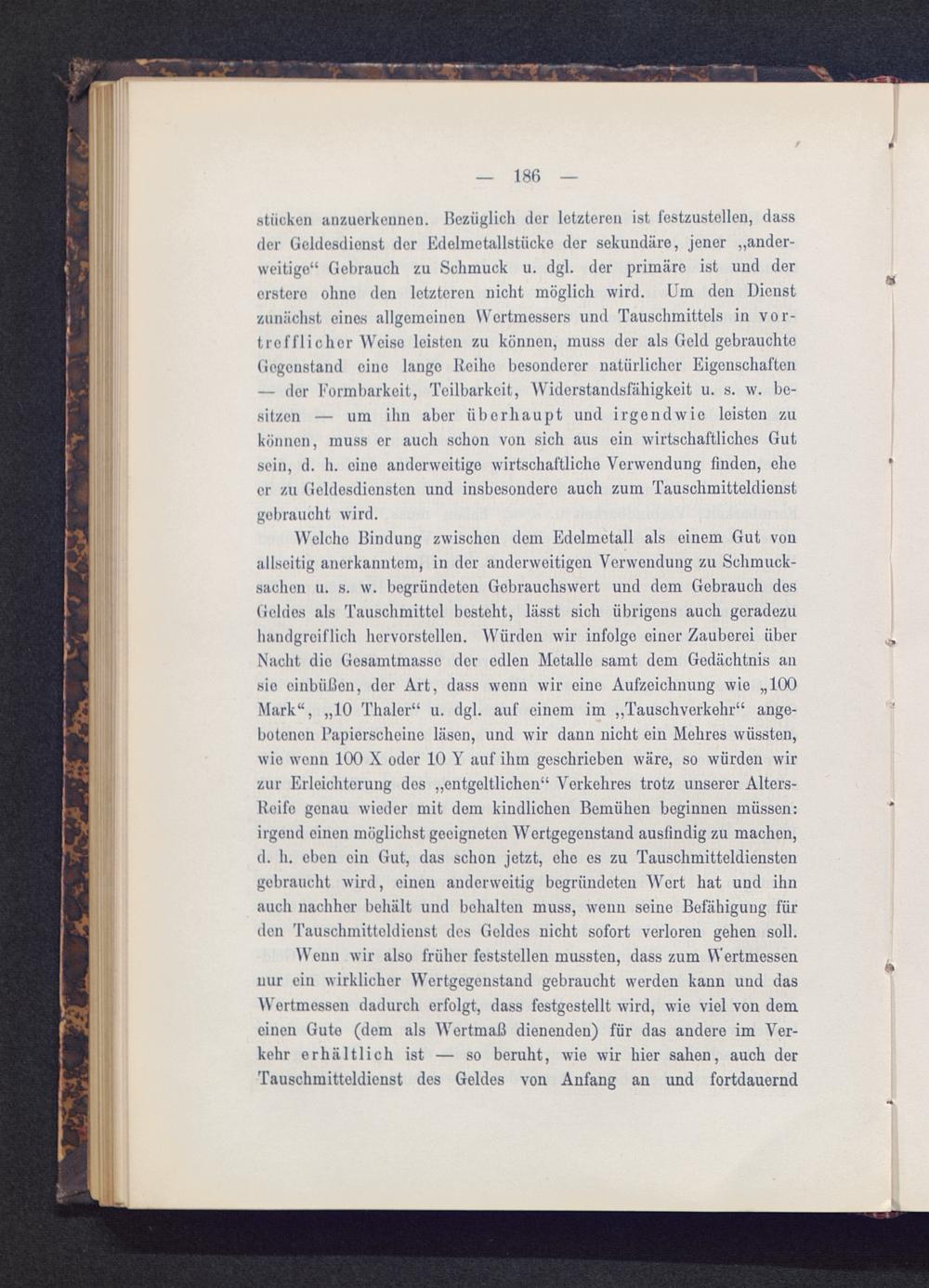 Wenn wir also früher feststellen mussten, dass zum Wertmessennur ein wirklicher Wertgegenstand gebraucht werden kann und dasWertmessen dadurch erfolgt, dass festgestellt wird, wie viel von demeinen Gute (dem als Wertmaß dienenden) für das andere im Ver-kehr erhältlich ist — so beruht, wie wir hier sahen, auch derTauschmitteldienst des Geldes von Anfang an und fortdauernd