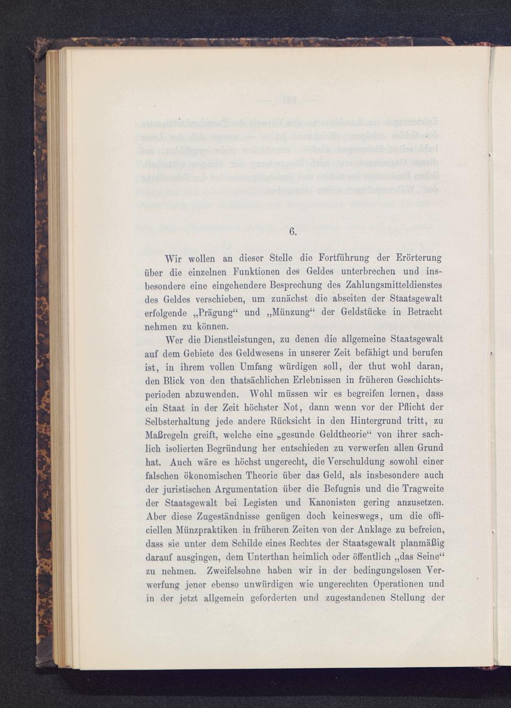 Wir wollen an dieser Stelle die Fortführung der Erörterungüber die einzelnen Funktionen des Geldes unterbrechen und ins-besondere eine eingehendere Besprechung des Zahlungsmitteldienstesdes Geldes verschieben, um zunächst die abseiten der Staatsgewalterfolgende „Prägung“ und „Münzung“ der Geldstücke in Betrachtnehmen zu können.