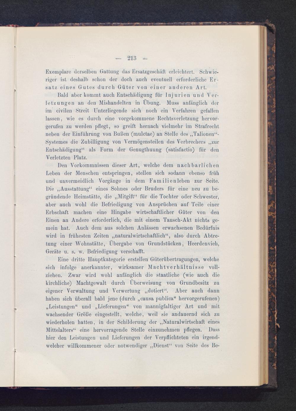 Ikid aber kommt auch Entschädigung für Injurien und Ver-letzungen an den Mishandelten in Übung. Muss anfänglich derim civilen Streit Unterliegende sich noch ein Verfahren gefallenlassen, wie es durch eine vorgekommene Rechtsverletzung hervor-gerufen zu werden pflegt, so greift hernach vielmehr im Strafrechtneben der Einführung von Bußen (mulctac) an Stelle des „Talionen“-Systemes die Zubilligung von Vermögensteilen des Verbrechers „zurEntschädigung" 4 als Form der Genugtuung (satisfactio) für denVerletzten Platz.