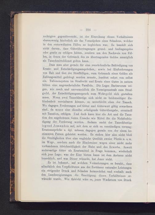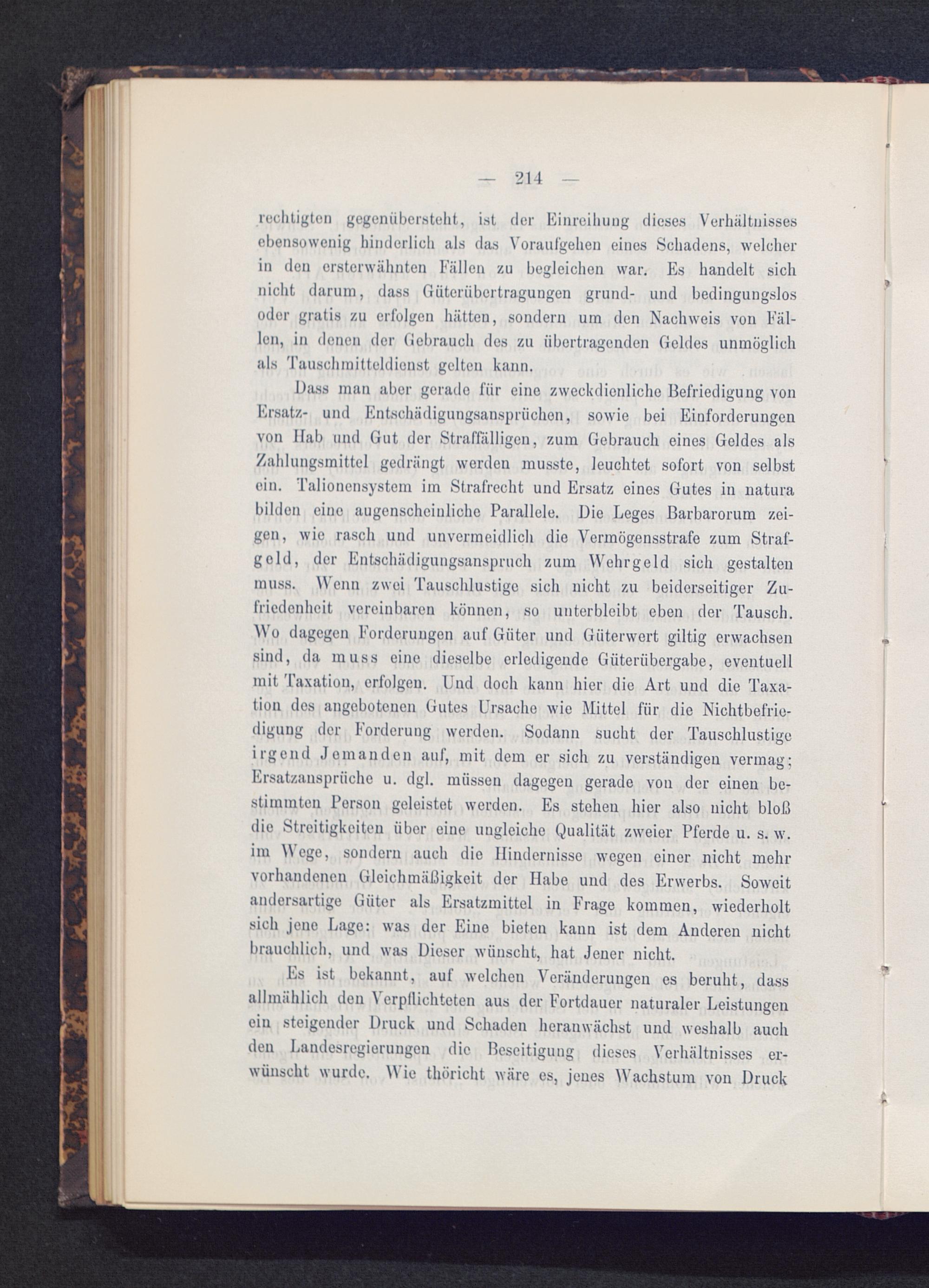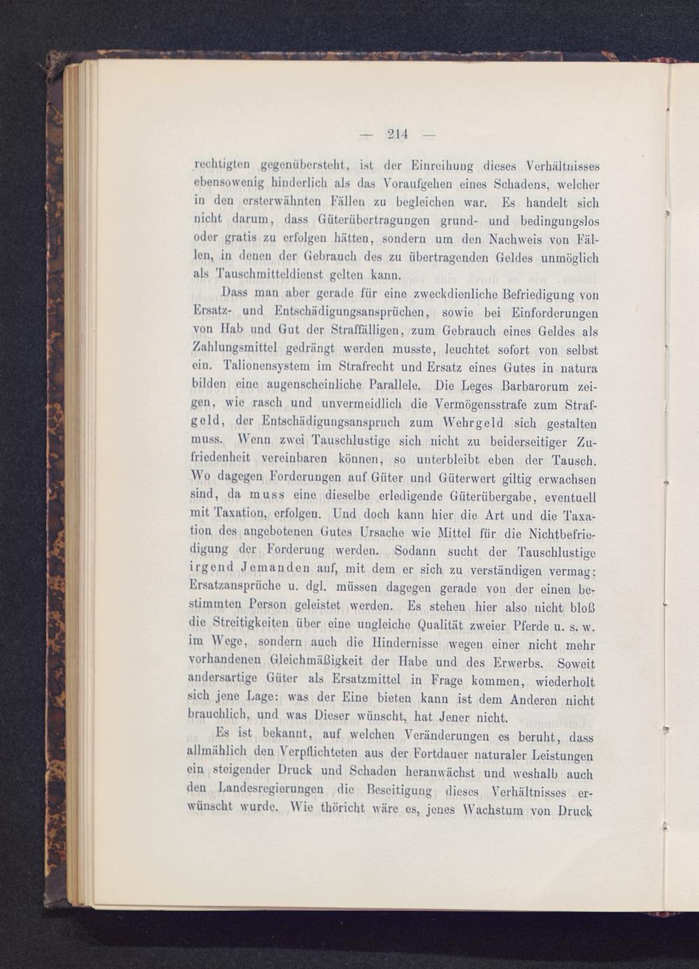 Dass man aber gerade für eine zweckdienliche Befriedigung vonErsatz- und Entschädigungsansprüchen, sowie bei Einforderungenvon Hab und Gut der Straffälligen, zum Gebrauch eines Geldes alsZahlungsmittel gedrängt werden musste, leuchtet sofort von selbstein. Talionensystem im Strafrecht und Ersatz eines Gutes in naturabilden eino augenscheinliche Parallele. Die Leges Barbarorum zei-gen, wie rasch und unvermeidlich die Vermögensstrafe zum Straf-geld, der Entschädigungsanspruch zum Wehrgeld sich gestaltenmuss. Wenn zwei Tauschlustige sich nicht zu beiderseitiger Zu-friedenheit vereinbaren können, so unterbleibt eben der Tausch.Wo dagegen Forderungen auf Güter und Güterwert gütig erwachsensind, da muss eino dieselbe erledigende Güterübergabe, eventuellmit Taxation, erfolgen. Und doch kann hier die Art und die Taxa-tion dos angebotenen Gutes Ursache wie Mittel für die Nichtbefrie-digung der Forderung werden. Sodann sucht der Tauschlustigeirgend Jemanden auf, mit dem er sich zu verständigen vermag;Ersatzansprüche u. dgl. müssen dagegen gerade von der einen be-stimmten Person geleistet werden. Es stehen hier also nicht bloßdie Streitigkeiten über eine ungleiche Qualität zweier Pferde u. s. w.im Wege, sondern auch die Hindernisse wegen einer nicht mehrvorhandenen Gleichmäßigkeit der Habe und des Erwerbs. Soweitandersartige Güter als Ersatzmittel in Frage kommen, wiederholtsich jene Lage: was der Eine bieten kann ist dem Anderen nichtbrauchlich, und was Dieser wünscht, hat Jener nicht.