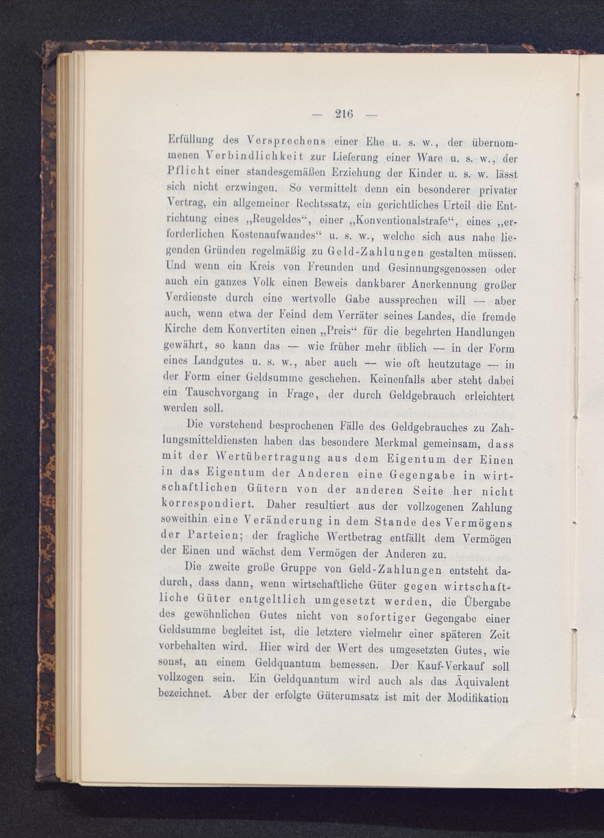 Erfüllung des Versprechens einer Ehe u. s. w., der übernom-menen Verbindlichkeit zur Lieferung einer Ware u. s. w., derPflicht einer standesgemäßen Erziehung der Kinder u. s. w. lässtsich nicht erzwingen. So vermittelt denn ein besonderer privaterVertrag, ein allgemeiner Rechtssatz, ein gerichtliches Urteil die Ent-richtung eines „Reugeldes“, einer „Konventionalstrafe“, eines „er-forderlichen Kostenaufwandes“ u. s. w., welche sich aus nahe lie-genden Gründen regelmäßig zu Geld-Zahlungen gestalten müssen.Und wenn ein Kreis von Freunden und Gesinnungsgenossen oderauch ein ganzes Volk einen Beweis dankbarer Anerkennung großerVerdienste durch eine wertvollo Gabe aussprechen will — aberauch, wenn etwa der Feind dem Verräter seines Landes, die fremdeKirche dem Konvertiten einen „Preis“ für die begehrten Handlungengewährt, so kann das — wie früher mehr üblich — in der Formeines Landgutes u. s. w., aber auch — wie oft heutzutage — inder Form einer Geldsumme geschehen. Keinenfalls aber steht dabeiein Tauschvorgaug in Frago, der durch Geldgebrauch erleichtertworden soll.