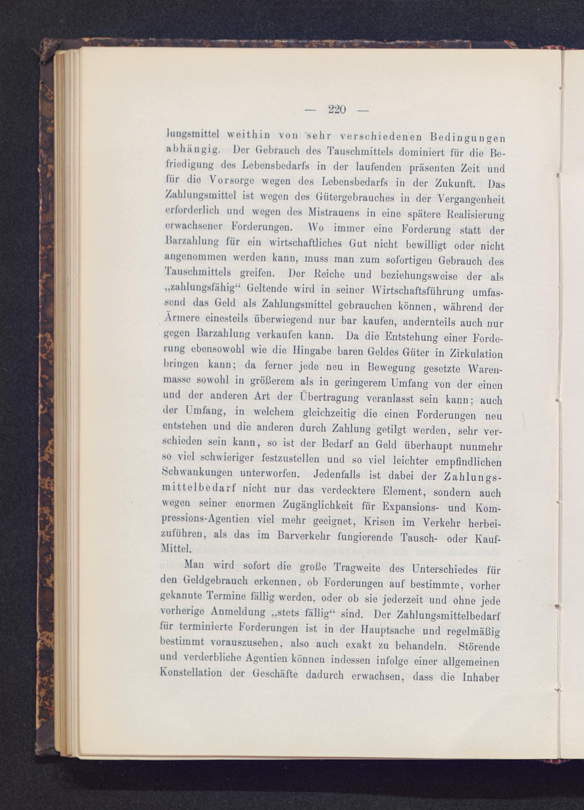 lungsmittel weithin von sehr verschiedenen Bedingungenabhängig. Der Gebrauch des Tausclunittels dominiert für die Be-friedigung des Lebensbedarfs in der laufenden präsenten Zeit undfür die Vorsorge wegen dos Lebensbedarfs in der Zukunft. DasZahlungsmittel ist wegen des Gütergebrauches in der Vergangenheiterforderlich und wegen des Mistrauens in eine spätere Realisierungerwachsener Forderungon. Wo immer eine Forderung statt derBarzahlung für ein wirtschaftliches Gut nicht bewilligt oder nichtangenommen werden kann, muss man zum sofortigen Gebrauch desTausohmittels greifen. Der Reiche und beziehungsweise der als„zahlungsfähig“ Geltende wird in seiner Wirtschaftsführung umfas-send das Geld als Zahlungsmittel gebrauchen können, während derÄrmere einesteils überwiegend nur bar kaufen, andernteils auch nurgegen Barzahlung vorkaufen kann. Da die Entstehung einer Forde-rung ebensowohl wie die Hingabe baren Geldes Güter in Zirkulationbringen kann; da ferner jede neu in Bewegung gesetzte Waren-masso sowohl in gröJ.lorem als in geringerem Umfang von der einenund der anderen Art der Übertragung veranlasst sein kann; auchder Umfang, in welchem gleichzeitig die einen Forderungen neuentstehen und die anderen durch Zahlung getilgt werden, sehr ver-schieden sein kann, so ist der Bedarf an Geld überhaupt nunmehrso viel schwieriger festzustellen und so viel leichter empfindlichen.Schwankungen unterworfen. Jedenfalls ist dabei der Zahlungs-mittelbedarf nicht nur das verdecktere Element, sondern auchwogen seiner enormen Zugänglichkeit für Expansions- und Kom-prossions-Agontien viel mehr geeignet, Krisen im Verkehr herbei-zuführon, als das im Barverkehr fungierende Tausch- oder Kauf-Mittel.