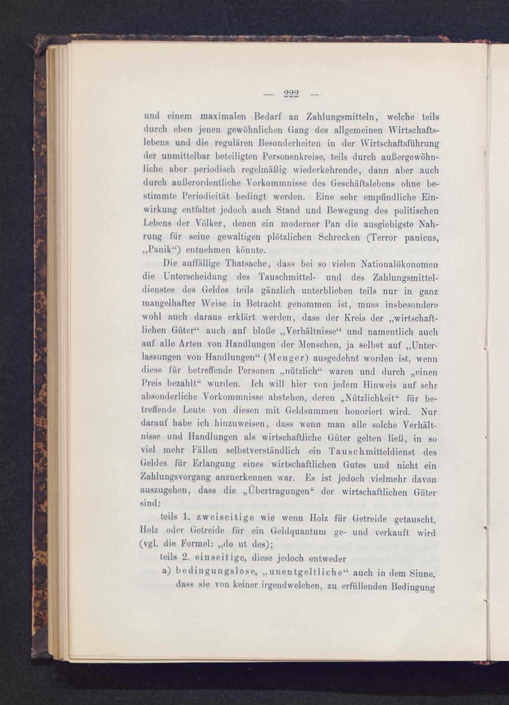 Die auffällige Thatsaclie, dass bei so vielen Nationalökonomendie Unterscheidung des Tauschmittel- und des Zahlungsmittel-dienstes des Geldes teils gänzlich unterblieben teils nur in ganzmangelhafter Weise in Betracht genommen ist, muss insbesonderewohl auch daraus erklärt werden, dass der Kreis der „wirtschaft-lichen Güter“ auch auf bloße „Verhältnisse“ und namentlich auchauf alle Arten von Handlungen der Menschen, ja selbst auf „Unter-lassungen von Handlungen“ (Menger) ausgedehnt worden ist, wenndiese für betreffende Personen „nützlich“ waren und durch „einenPreis bezahlt“ wurden. Teil will hier von jedem Hinweis auf sehrabsonderliche Vorkommnisse abstehen, deren „Nützlichkeit“ für be-treffende Leute von diesen mit Geldsummen honoriert wird. Nurdarauf habe ich hinzu weisen, dass wenn man alle solche Verhält-nisse und Handlungen als wirtschaftliche Güter gelten ließ, in soviel mehr Fällen selbstverständlich ein Tauschmitteldienst desGeldes für Erlangung eines wirtschaftlichen Gutes und nicht einZahlungsvorgang anzuerkennen war. Es ist jedoch vielmehr davonauszugehen, dass die „Übertragungen“ der wirtschaftlichen Gütersind: