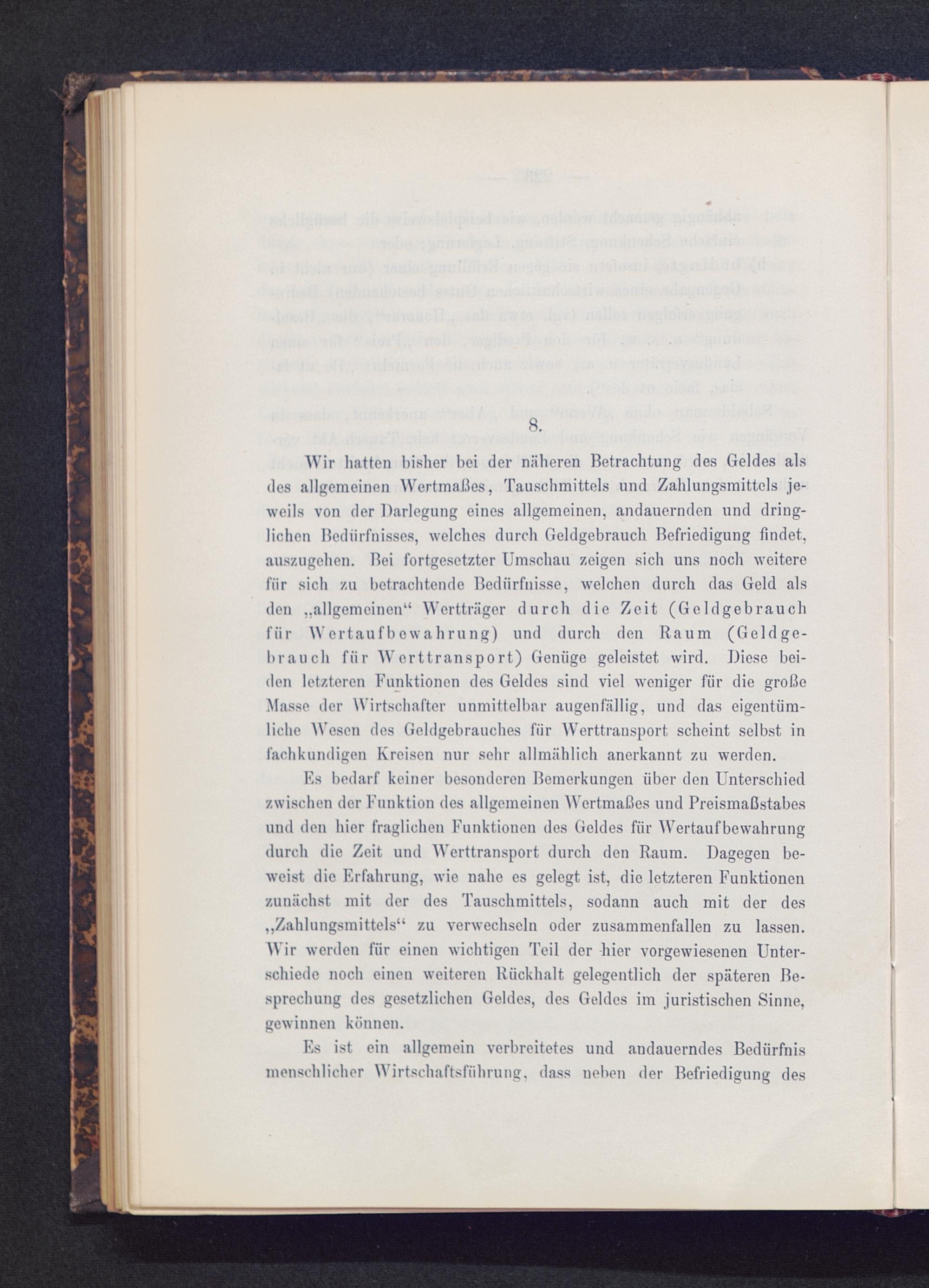F.s bedarf keiner besonderen Bemerkungen über den Unterschiedzwischen der Funktion des allgemeinen Wertmaßes und Preismaßstabesund den hier fraglichen Funktionen des Geldes für Wertaufbewahrungdurch die Zeit und AVerttransport durch den Raum. Dagegen be-weist die Erfahrung, wie nahe es gelegt ist, die letzteren Funktionenzunächst mit der des Tauschmittels, sodann auch mit der des„Zahlungsmittels“ zu verwechseln oder zusammenfallen zu lassen.AYir werden für einen wichtigen Teil der hier vorgewiesenen Unter-schiede noch einen weiteren Rückhalt gelegentlich der späteren Be-sprechung des gesetzlichen Geldes, des Geldes im juristischen Sinne,gewinnen können.