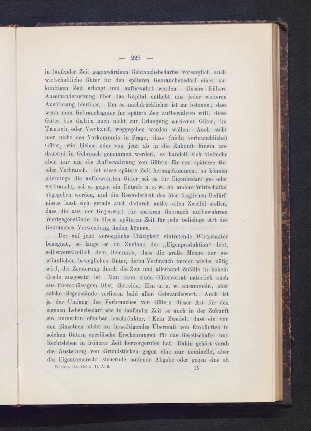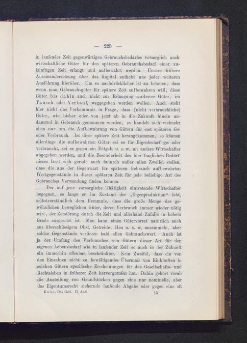 in laufender Zeit gegenwärtigen Gebrauchsbedarfes vorsorglich auchwirtschaftliche Güter für den späteren Gebrauchsbedarf einer zu-künftigen Zeit erlangt und aufbewahrt werden. Unsere frühereAuseinandersetzung über das Kapital enthebt uns jeder weiterenAusführung hierüber. Um so nachdrücklicher ist zu betonen, dasswenn man Gebrauchsgüter für spätere Zeit aufbewahren will, dieseGüter bis dahin auch nicht zur Erlangung anderer Güter, imTausch oder Verkauf, weggegeben worden wollen. Auch stehthier nicht das Vorkommnis in Frage, dass (nicht verbrauchliche)Güter, wie bisher oder von jetzt ab in die Zukunft hinein an-dauernd in Gebrauch genommen werden, es handelt sich vielmehreben nur um die Aufbewahrung von Gütern für erst späteren Ge-oder Verbrauch. Ist diese spätere Zeit herangekommen, so könnenallerdings die aufbewahrten Güter sei es für Eigenbedarf ge- oderverbraucht, sei es gegen ein Entgelt u. s. w. an andere Wirtschafterabgegeben werden, und die Besonderheit des hier fraglichen Bedürf-nisses lässt sich gerade auch dadurch außer allen Zweifel stellen,dass die aus der Gegenwart für späteren Gebrauch aufbewahrtenWertgegenstände in dieser späteren Zeit für jede beliebige Art desGebrauches Verwendung finden können.