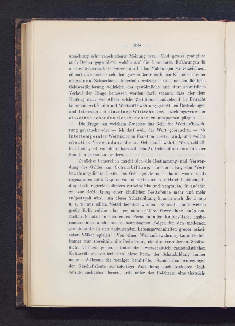 Zunächst bemerklich macht sich die Bestimmung und Verwen-dung des Geldes zur Schatzbildung. In der That, den Wert-bewahrungsdienst leistet das Geld gerade auch dann, wenn es alssogenanntes totes Kapital von dem Geizhals zur Hand behalten, indespotisch regierten Ländern verheimlicht und vergraben, in anderenwie zur Befriedigung einer kindlichen Besitzfreude mehr und mehraufgestapelt wird. An dieser Schatzbildung können auch die Geräteu. s. w. aus edlem Metall beteiligt werden. Es ist bekannt, welchegrolle Rollo solche ohne geplante spätere Verwendung aufgesam-melten Schätze in den ersten Perioden aller Kulturvölker, insbe-sondere aber auch mit so bedeutsamen Folgen für den modernen„Geldmarkt“ in den andauernden Lebensgewohnheiten großer asiati-scher Völker spielen! Von einer Wertaufbewahrung kann freilichimmer nur soweithin die Rede sein, als die vergrabenen Schätzenicht verloren gehen. Unter den wirtschaftlich rationalistischenKulturvölkern verliert sich diese Form der Schatzbildung immermehr. \\ ährend die weniger bemittelten Stände den Anregungendor Geschäftsleute zu sofortiger Ausleihung auch kleinerer Geld-vorräte naehgehen lernen, tritt unter den Reicheren eine thatsäch-