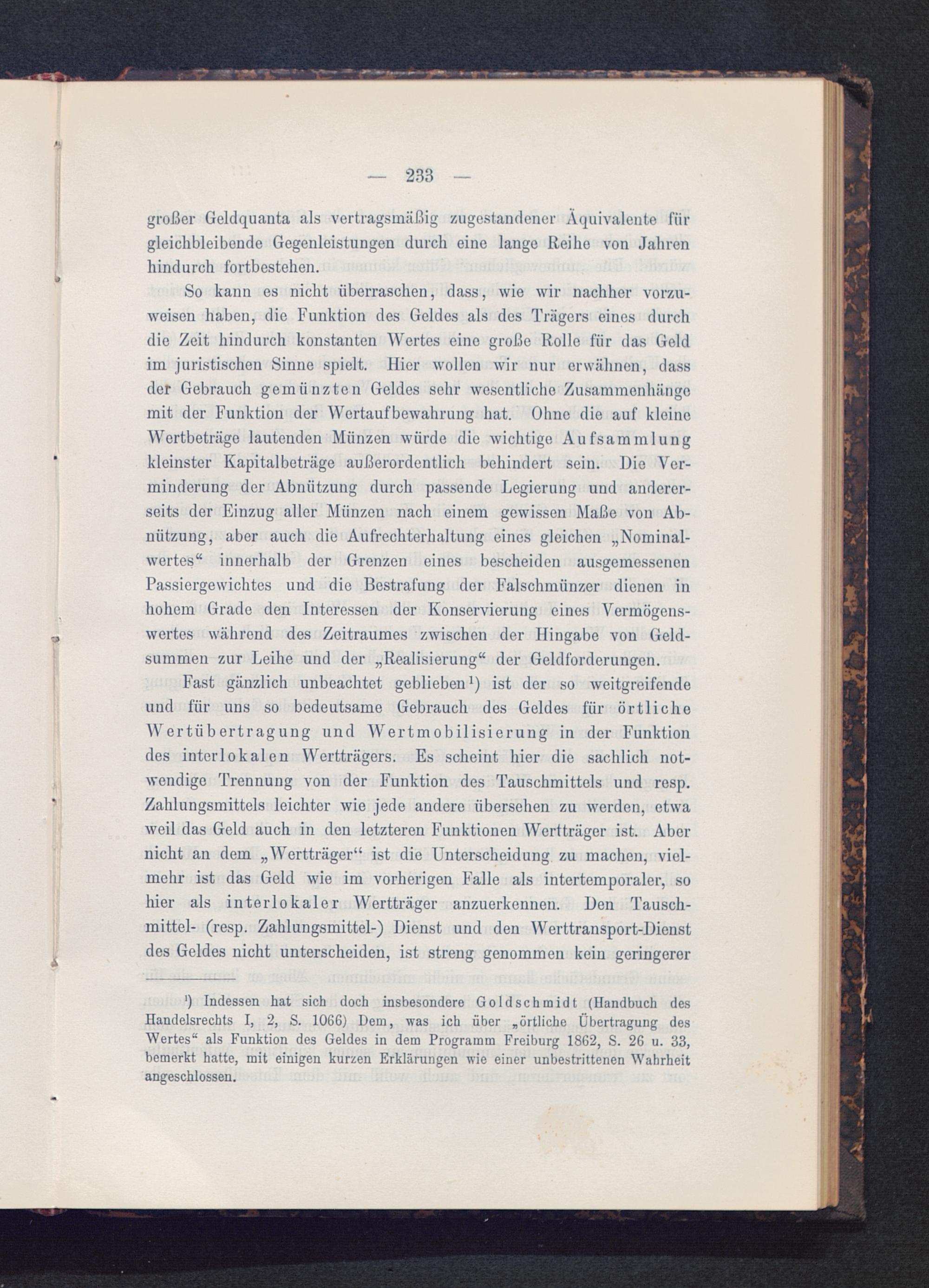 ‘) Indessen hat sich doch insbesondere Goldschmidt (Handbuch desHandelsrechts I , 2, S. 1066) Dem, was ich über „örtliche Übertragung desWertes“ als Funktion des Geldes in dem Programm Freiburg 1862, S. 26 u. 33,bemerkt hatte, mit einigen kurzen Erklärungen wie einer unbestrittenen Wahrheitangeschlossen.
