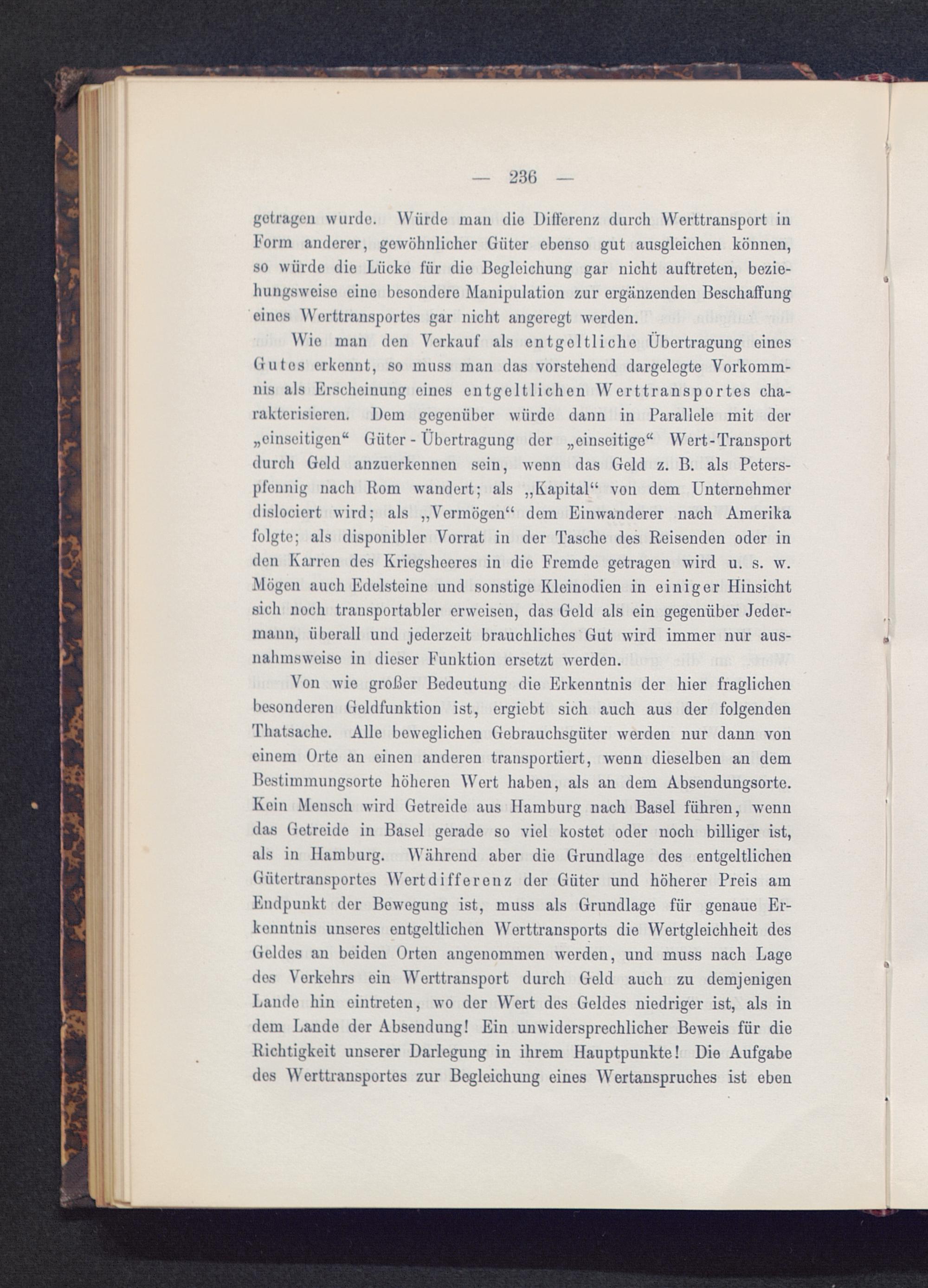 Von wie großer Bedeutung die Erkenntnis der hier fraglichenbesonderen Geldfunktion ist, ergiebt sich auch aus der folgendenThatsache . Alle beweglichen Gebrauchsgüter werden nur dann voneinem Orte an einen anderen transportiert, wenn dieselben an demBestimmungsorte höheren Wert haben, als an dem Absendungsorte.Koin Mensch wird Getreide aus Hamburg nach Basel führen, wenndas Getreide in Basel gerade so viel kostet oder noch billiger ist,als in Hamburg . Während aber die Grundlage des entgeltlichenGütertransportes Wertdifferenz der Güter und höherer Preis amEndpunkt der Bewegung ist, muss als Grundlage für genaue Er-kenntnis unseres entgeltliehen Werttransports die Wertgleichheit desGeldes an beiden Orten angenommen werden, und muss nach Lagedes Vorkehrs ein Werttransport durch Geld auch zu demjenigenLande hin eintreten, wo der Wert des Geldes niedriger ist, als indem Lande der Absendung! Ein unwidersprechlicher Beweis für dieRichtigkeit unserer Darlegung in ihrem Hauptpunkte! Die Aufgabedes Werttransportes zur Begleichung eines Wertanspruches ist eben