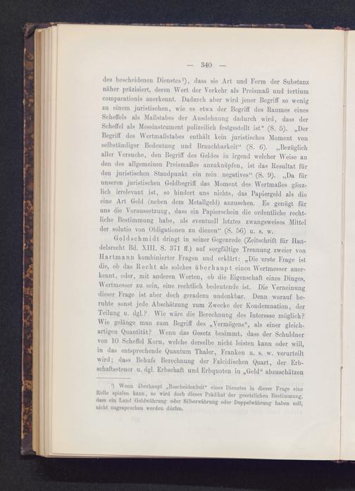 Gold Schmidt dringt in seiner Gegenrede (Zeitschrift für Han-delsrecht Bd. XIII. S. 371 ff.) auf sorgfältige Trennung zweier vonIlartmann kombinierter Fragen und erklärt: „Die-erste Frage istdie, ob das Recht als solches überhaupt einen Wertmesser aner-kennt, oder, mit anderen Worten, ob die Eigenschaft eines Dinges,Wertmesser zu sein, eine rechtlich bedeutende ist. Die Verneinungdieser Frage ist aber doch geradezu undenkbar. Denn worauf be-ruhte sonst jede Abschätzung zum Zwecke der Kondemnation, derTeilung u. dgl.? Wie wäre die Berechnung des Interesse möglich?Wie gelänge man zum Begriff des „Vermögens“, als einer gleich-artigen Quantität? Wenn das Gesetz besimmt, dass der Schuldnervon 10 Scheffel Korn, welche derselbe nicht leisten kann oder will,in das entsprechende Quantum Thaler, Franken u. s. w. verurteiltwird; dass Behufs Berechnung der Falcidischen Quart, der Erb-schaftssteuer u. dgl. Erbschaft und Erbquoten in „Geld“ abzuschätzen