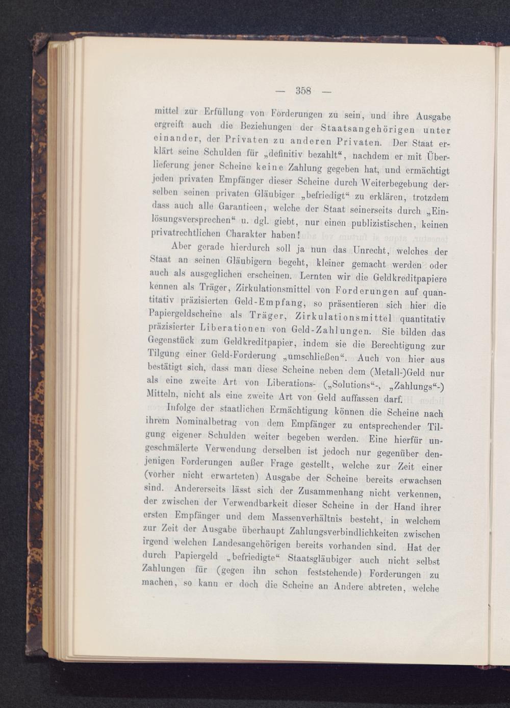Infolgo der staatlichen Ermächtigung können die Scheine nachihrem Nominalbetrag von dem Empfänger zu entsprechender Til-gung eigener Schulden weiter begeben werden. Eine hierfür un-geschmälerte Verwendung derselben ist jedoch nur gegenüber den-jenigen Forderungen außer Frage gestellt, welche zur Zeit einer(vorher nicht erwarteten) Ausgabe der Scheine bereits erwachsensind. Andererseits lässt sich der Zusammenhang nicht verkennen,der zwischen der Verwendbarkeit dieser Scheine in der Hand ihrerersten Empfänger und dem Massenverhältnis besteht, in welchemzur Zeit der Ausgabe überhaupt Zahlungsverbindlichkeiten zwischenirgend welchen Landesangehörigen bereits vorhanden sind. Hat derdurch Papiergeld „befriedigte“ Staatsgläubiger auch nicht selbstZahlungon für (gegen ihn schon feststehende) Forderungen zumachen, so kann er doch die Scheine an Andere abtreten, welche