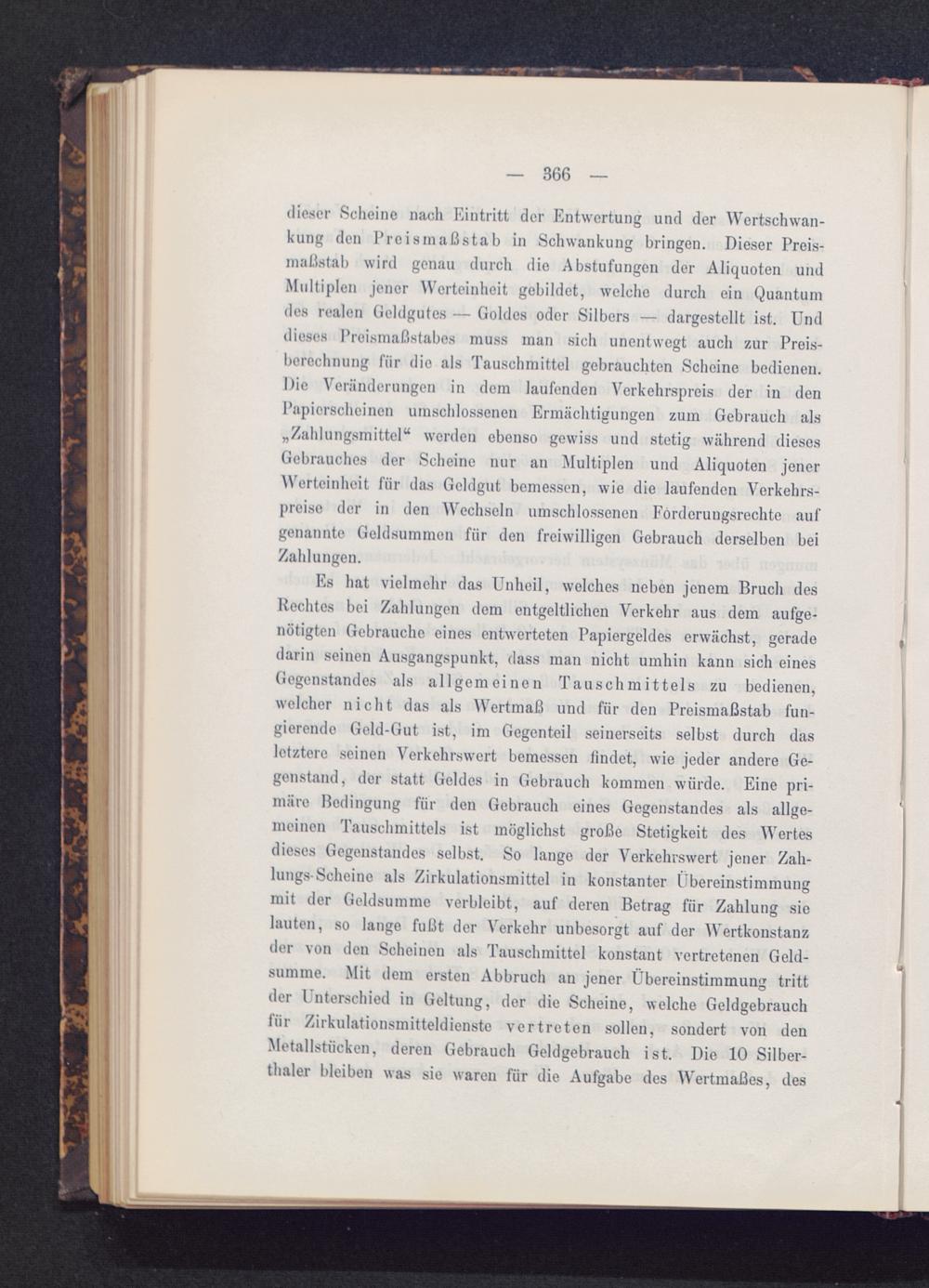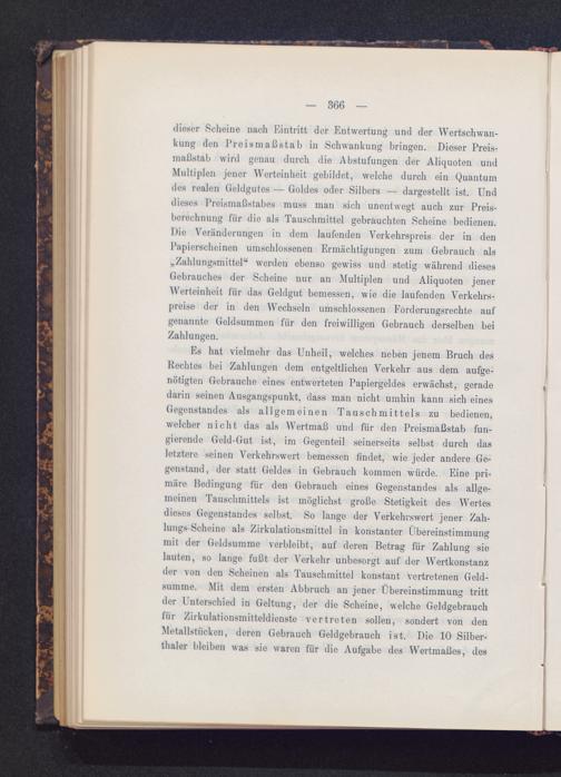 dieser Scheine nach Eintritt der Entwertung und der Wertschwan-kung den Preismaßstab in Schwankung bringen. Dieser Preis-maßstab wird genau durch die Abstufungen der Aliquoten undMultiplen jener Werteinheit gebildet, welche durch ein Quantumdes realen Geldgutes — Goldes oder Silbers — dargestellt ist. Unddieses Preismaßstabes muss man sich unentwegt auch zur Preis-berechnung für die als Tauschmittel gebrauchten Scheine bedienen.Die Veränderungen in dem laufenden Verkehrspreis der in denPapierscheinen umschlossenen Ermächtigungen zum Gebrauch als„Zahlungsmittel“ werden ebenso gewiss und stetig während diesesGebrauches der Scheine nur an Multiplen und Aliquoten jenerWerteinheit für das Geldgut bemessen, wie die laufenden Vcrkehrs-preiso der in den Wechseln umschlossenen Förderuugsrechte aufgenannte Geldsummen für den freiwilligen Gebrauch derselben beiZahlungen.