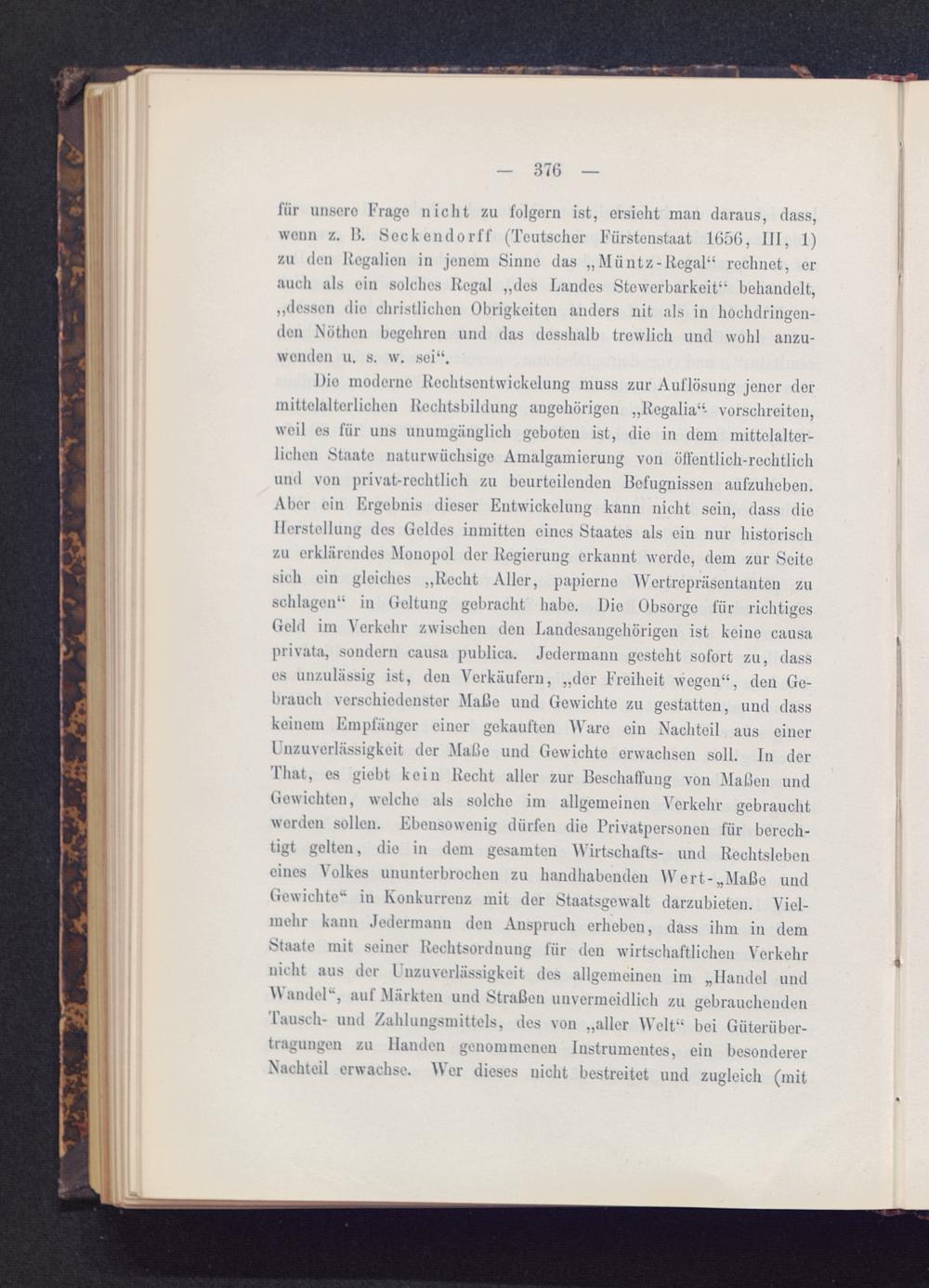 Dio moderne Rcchtsoutwickelung muss zur Auflösung jener dermittelalterlichen Rechtsbildung augehörigen „Regalia“- vorschreiten,weil es für uns unumgänglich geboten ist, die in dem mittelalter-lichen Staate naturwüchsige Amalgamierung von öffentlich-rechtlichund von privat-rechtlich zu beurteilenden Befugnissen aufzuheben.Aber ein Ergebnis dieser Entwickelung kann nicht sein, dass dieHerstellung des Geldes inmitten eines Staates als ein nur historischzu erklärendes Monopol der Regierung erkannt werde, dem zur Seitesich ein gleiches „Recht Aller, papierne Wortrcpräsentauten zuschlagen“ in Geltung gebracht habo. Die Obsorge für richtigesGeld im Verkehr zwischen den Landesaugehörigen ist keine causaprivata, sondern causa publica. Jedermann gesteht sofort zu, dasses unzulässig ist, den Verkäufern, „der Freiheit wegen“, den Ge-brauch verschiedenster Maße und Gewichte zu gestatten, und dasskeinem Empfänger einer gekauften AVaro eiu Nachteil aus einerUnzuverlässigkeit der Malle und Gewichte erwachsen soll. In derThat, es giebt kein Recht aller zur Beschaffung von Maßen undGewichten, welche als solche im allgemeinen Verkehr gebrauchtworden sollen. Ebensowenig dürfen die Privatpersonen für berech-tigt gelten, dio in dem gesamten AVirtschafts- und Rechtslebeneines A'olkes ununterbrochen zu handhabenden AVert-„Maße undGewichte“ in Konkurrenz mit der Staatsgewalt darzubieten. Auel-mehr kann Jedermann den Anspruch erheben, dass ihm in demStaate mit seiner Rechtsordnung für den wirtschaftlichen A r erkehrnicht aus der Unzuverlässigkeit des allgemeinen im „Handel undAYandel“, auf Märkten und Straßen unvermeidlich zu gebrauchendenTausch- und Zahlungsmittels, des von „aller AVelt“ bei Güterüber-tragungen zu Händen genommenen Instrumentes, ein besondererNachteil erwachse. AA'er dieses nicht bestreitet und zugleich (mit