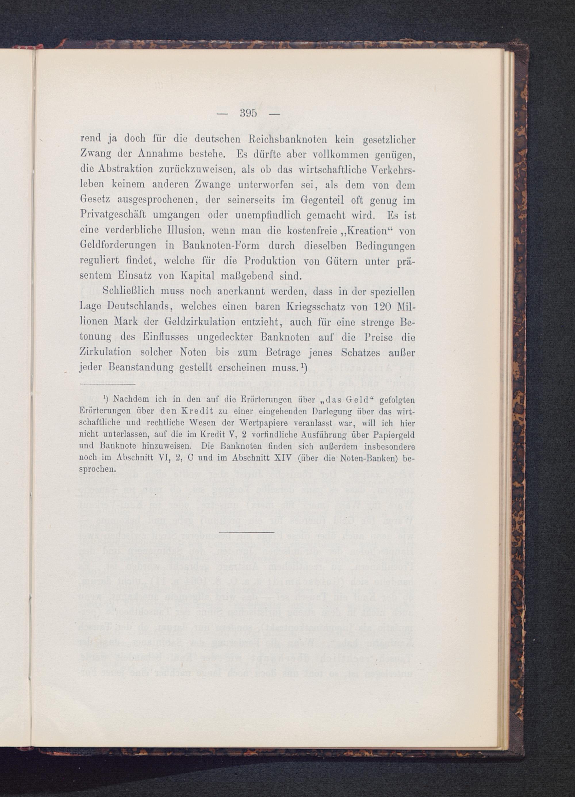 ') Nachdem ich in den auf die Erörterungen über „das Geld“ gefolgtenErörterungen über den Kredit zu einer eingehenden Darlegung über das wirt-schaftliche und rechtliche Wesen der Wertpapiere veranlasst war, will ich hiernicht unterlassen, auf die im Kredit V, 2 vorfindliche Ausführung über Papiergeldund Banknote hinzuweisen. Die Banknoten finden sich außerdem insbesonderenoch im Abschnitt VI, 2, C und im Abschnitt XIV (über die Noten-Banken) be-sprochen.