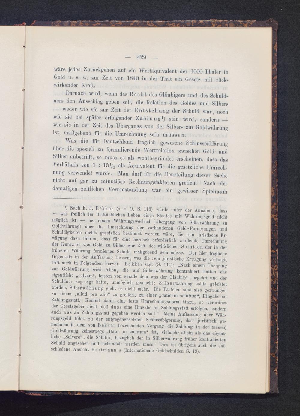 ') Nach E. J. Bekker (a. a. 0. S. 113) würde unter der Annahme, dass— was freilich im thatsächlichen Leben eines Staates mit Währungsgeld nichtmöglich ist — bei einem WährungsWechsel (Übergang von Silberwährung zuGoldwährung) über die Umrechnung der vorhandenen Geld-Forderungen undSchuldigkeiten nichts gesetzlich bestimmt worden wäre, die rein juristische Er-wägung dazu führen, dass für eine hernach erforderlich werdende Umrechnungder Kurswert von Gold zu Silber zur Zeit der wirklichen Solution der in derfrüheren Währung formierten Schuld maßgebend sein müsse. Der hier fraglicheGegensatz in der Auffassung Dessen, was die rein juristische Erwägung verlangt,tritt auch in Folgendem hervor. Bekker sagt (S. 114): „Nach einem Übergangzur Goldwährung wird Allen, die auf Silberwährung kontrahiert hatten daseigentliche „solvere“, leisten von gerade dem was der Gläubiger begehrt und derSchuldner zugesagt hatte, unmöglich gemacht: Silberwährung sollte geleistetw'erden, Silberwährung giebt es nicht mehr. Die Parteien sind also gezwungenzu einem „aliud pro alio“ zu greifen, zu einer „datio in solutum“, Hingabe anZahlungsstatt. Kommt dann eine feste Umrechnungsnorm hinzu, so verordnetder Gesetzgeber nicht bloß dass eine Hingabe an Zahlungsstatt erfolgen, sondernauch was an Zahlungsstatt gegeben werden soll.“ Meine Auffassung über Wäh-rungsgeld führt zu der entgegengesetzten Schlussfolgerung, dass juristisch ge-nommen in dem von Bekker bezeichneten Vorgang die Zahlung in der (neuen)Goldwährung keineswegs „Datio in solutum“ ist, vielmehr allein als das eigent-liche „Solvere“, die Solutio, bezüglich der in Silberwährung früher kontrahiertenSchuld angesehen und behandelt werden muss. Dies ist übrigens auch die ent-schiedene Ansicht Hartmann’s (Internationale Geldschulden S. 19).