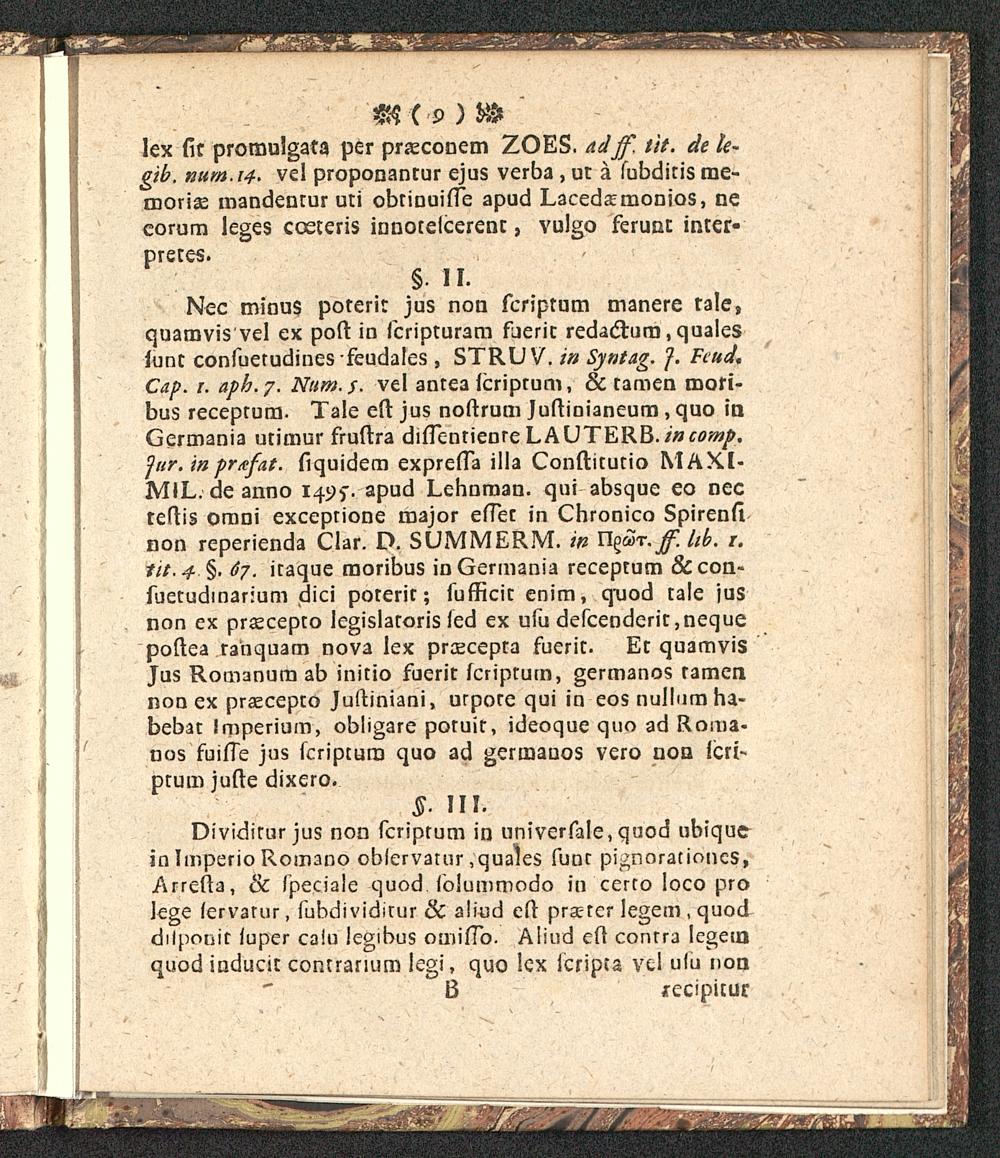 Nec minus poterit jus non fcriptum manere rale,quarovis vel ex poft in fcripturam fueric redacturo, qualesiunt confuetudines feudales , STRUV. in Syntag. J. Fiud.Cap. i. apb.y. Nttm.s. vel antea lcriptum, & tamen mori-bus receptum. Tale eft jus noftrum Juftinianeum, quo inGermania utimur fruftra difTentienre LAUTERB. incomp.fur. in pritfat. fiquidem exprefTa illa Conftitutio MAXl-MIL. de anno 1495". apud Lehnman. qut absque eo necteftis omni exceprione major effer in Chronico Spirenftnon reperienda Clar. D. SUMMERM. in U^T.ff.hb. z.iit.4.%. 67. itaque moribus inGermania receptum &con-fuetudmarium dici poteric; fufficic enim, quod tale jusnon ex prsecepro legislaroris led ex ufu defcenderit,nequepoftea rahquam nova lex prcecepta fuerit. Et quamvisJus Romanum ab initio fuerit fcriptum, germanos tamennon ex praecepto Juftiniani, urpore qui in eos nullumha-bebat Imperium, obligare poruit, ideoque quo ad Roma-nos fuiffe jus fcriptum quo ad germauos vero non lcri-ptum jufte dixero.